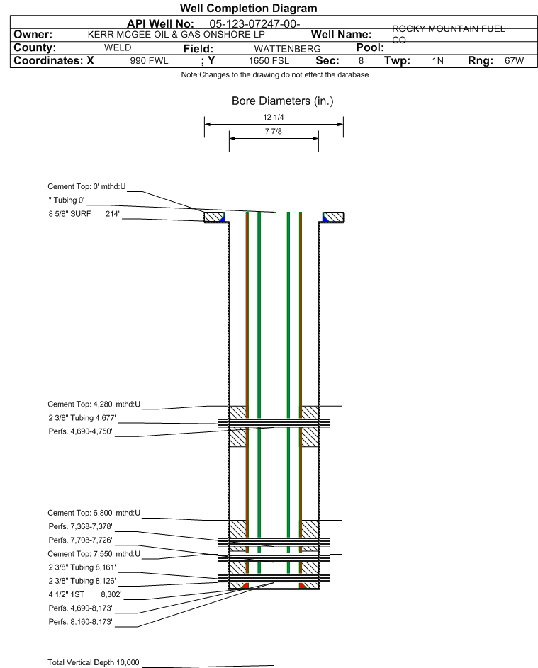 | Wellbore Completed | | Completion Date: | N/A | | Spud Date: | 2/24/1971 | Spud Date Is: | ACTUAL | | Measured TD: | 8302 ft. | Measured PB depth: | 8266 ft. | | True Vertical TD: | | True Vertical PB depth: | | | Log Types: | CBL | | Log Types: | IES, FDC, GR, CNP, CORRELATION, CBL | | Casing: | String Type: SURF, Hole Size: 12.25 in., Size: 8.625 in., Top: 0 ft., Depth: 214 ft., Weight: 24 , Citings Type: ACTUAL | | Cement: | Sacks: 220, Top: 0 ft., Bottom: 214 ft., Determination Method: VISU | | Casing: | String Type: 1ST, Hole Size: 7.875 in., Size: 4.5 in., Top: 0 ft., Depth: 8302 ft., Weight: 10.5 , Citings Type: ACTUAL | | Cement: | Sacks: 200, Top: 7550 ft., Bottom: 8302 ft., Determination Method: CBL | | Casing: | String Type: S.C. 1.1, Hole Size: , Size: , Top: , Depth: 7480 ft., Weight: , Citings Type: ACTUAL | | Cement: | Sacks: 325, Top: 6800 ft., Bottom: 7480 ft., Determination Method: CBL | | Casing: | String Type: S.C. 1.2, Hole Size: , Size: , Top: , Depth: 5178 ft., Weight: , Citings Type: ACTUAL | | Cement: | Sacks: 425, Top: 4280 ft., Bottom: 5178 ft., Determination Method: CBL | | Casing: | String Type: S.C. 1.3, Hole Size: , Size: , Top: , Depth: 1050 ft., Weight: , Citings Type: ACTUAL | | Cement: | Sacks: 620, Top: 0 ft., Bottom: 1050 ft., Determination Method: CBL | | Additional Cement: | String Type: 1ST , Top: 0 ft., Depth: 1001 ft., Bottom: 1050 ft., Sacks: 620, Method: PERF & PUMP | | Additional Cement: | String Type: 1ST , Top: 4280 ft., Depth: 5021 ft., Bottom: 5178 ft., Sacks: 425, Method: SQUEEZE | | Additional Cement: | String Type: 1ST , Top: 6800 ft., Depth: 7480 ft., Bottom: 7480 ft., Sacks: 325, Method: SQUEEZE | | Formation | Interval Top | Log Bottom | Cored | DSTs | | CODELL | 7708 ft. | | N | N | | J SAND | 8126 ft. | | Y | N |