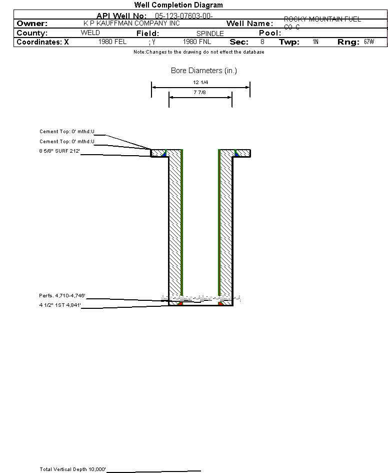 | Wellbore Completed | | Completion Date: | 12/21/1972 | | Spud Date: | 11/18/1972 | Spud Date Is: | ACTUAL | | Measured TD: | 4841 ft. | Measured PB depth: | 4795 ft. | | True Vertical TD: | 0 ft. | True Vertical PB depth: | | | Log Types: | IES, FDC-DENSITY-GR-CALIPER | | Casing: | String Type: SURF, Hole Size: 12.25 in., Size: 8.625 in., Top: 0 ft., Depth: 212 ft., Weight: 23 , Citings Type: ACTUAL | | Cement: | Sacks: 200, Top: 0 ft., Bottom: , Determination Method: | | Casing: | String Type: 1ST, Hole Size: 7.875 in., Size: 4.5 in., Top: 0 ft., Depth: 4841 ft., Weight: 10.5 , Citings Type: ACTUAL | | Cement: | Sacks: 200, Top: 0 ft., Bottom: , Determination Method: | | Formation | Interval Top | Log Bottom | Cored | DSTs | | SUSSEX | 4678 ft. | | Y | N |