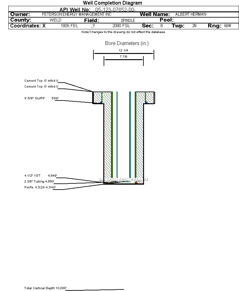 Wellbore #00 Wellbore Classification: OW Status: PA - 9/1/1996 Measured TD: 4650 ft.| Wellbore Data for Original Wellbore | Wellbore Classification: OW PA - 9/1/1996 | | Wellbore Permit | | | Permit #: | 19730083 | Expiration Date: | 2/8/1974 | | Proposed Depth/Form: | 4700 ft. | | Surface Mineral Owner Same: | Not available | | Mineral Owner: | FEE | Surface Owner: | Not available | | Unit: | | Unit Number: | | | Formation And Spacing: | Code: SUSX , Formation: SUSSEX , Order: , Unit Acreage: 80, Drill Unit: W2SE |