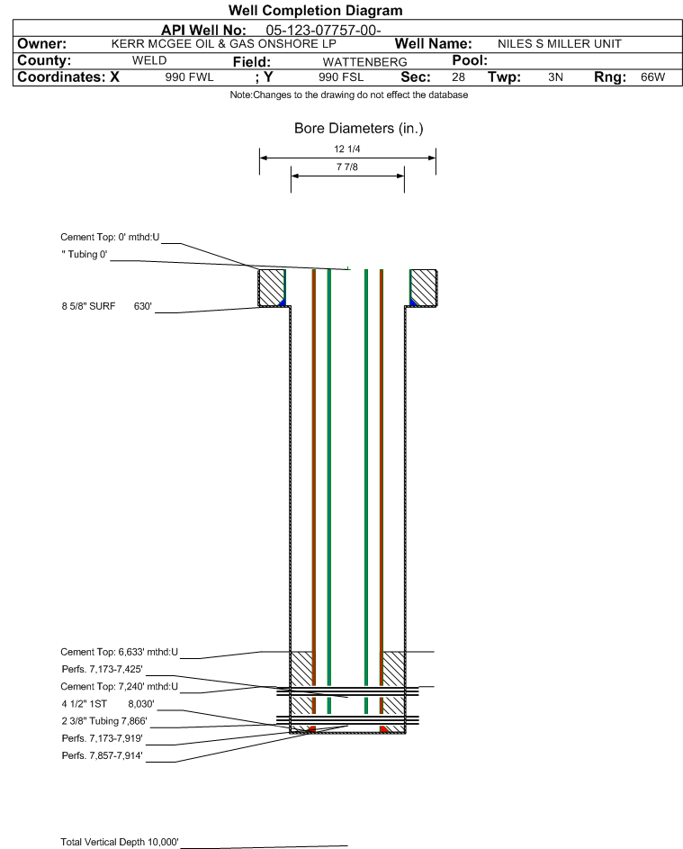 Wellbore #00 Wellbore Classification: GW Status: PA - 11/22/2016 Measured TD: 8030 ft. Wellbore Data for Original Wellbore | Wellbore Classification: GW PA - 11/22/2016 | Wellbore Permit | | Permit #: | 19730462 | Expiration Date: | 9/18/1997 | Proposed Depth/Form: | 8000 ft. | Surface Mineral Owner Same: | Not available | Mineral Owner: | FEE | Surface Owner: | Not available | Unit: | | Unit Number: | | Formation And Spacing: | Code: JSND , Formation: J SAND , Order: , Unit Acreage: 320, Drill Unit: W2 | Formation And Spacing: | Code: NB-CD , Formation: NIOBRARA-CODELL , Order: 407-66 , Unit Acreage: 80, Drill Unit: W2SW |