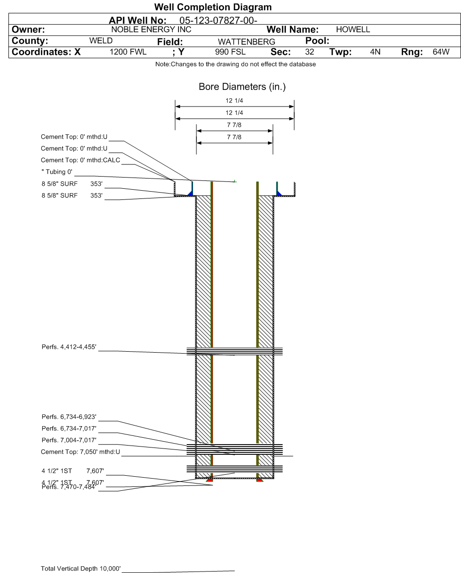 Wellbore Completed | Completion Date: | 9/2/1973 | Spud Date: | 8/23/1973 | Spud Date Is: | ACTUAL | Measured TD: | 7620 ft. | Measured PB depth: | 7558 ft. | True Vertical TD: | | True Vertical PB depth: | | Log Types: | CBL | Casing: | String Type: SURF, Hole Size: 12.25 in., Size: 8.625 in., Top: 0 ft., Depth: 353 ft., Weight: 23 , Citings Type: ACTUAL | Cement: | Sacks: 250, Top: 0 ft., Bottom: 353 ft., Determination Method: VISU | Casing: | String Type: 1ST, Hole Size: 7.875 in., Size: 4.5 in., Top: 0 ft., Depth: 7607 ft., Weight: 11.6 , Citings Type: ACTUAL | Cement: | Sacks: 200, Top: 7050 ft., Bottom: 7607 ft., Determination Method: CBL | Casing: | String Type: S.C. 1.1, Hole Size: 7.875 in., Size: 4.5 in., Top: 0 ft., Depth: 7607 ft., Weight: 11.6 , Citings Type: ACTUAL | Cement: | Sacks: 300, Top: 6316 ft., Bottom: 7015 ft., Determination Method: CBL | Casing: | String Type: S.C. 1.2, Hole Size: 7.875 in., Size: 4.5 in., Top: 0 ft., Depth: 7607 ft., Weight: 11.6 , Citings Type: ACTUAL | Cement: | Sacks: 425, Top: 4008 ft., Bottom: 4701 ft., Determination Method: CBL | Casing: | String Type: S.C. 1.3, Hole Size: 7.875 in., Size: 4.5 in., Top: 0 ft., Depth: 7607 ft., Weight: 11.6 , Citings Type: ACTUAL | Cement: | Sacks: 700, Top: 240 ft., Bottom: 2055 ft., Determination Method: CBL | Formation | Interval Top | Log Bottom | Cored | DSTs | SUSSEX | 4315 ft. | | | | NIOBRARA | 6704 ft. | | | | CODELL | 7002 ft. | | | | CARLILE | 7010 ft. | | | | GREENHORN | 7065 ft. | | | | BENTONITE | 7288 ft. | | | | D SAND | 7398 ft. | | | | J SAND | 7444 ft. | | | |