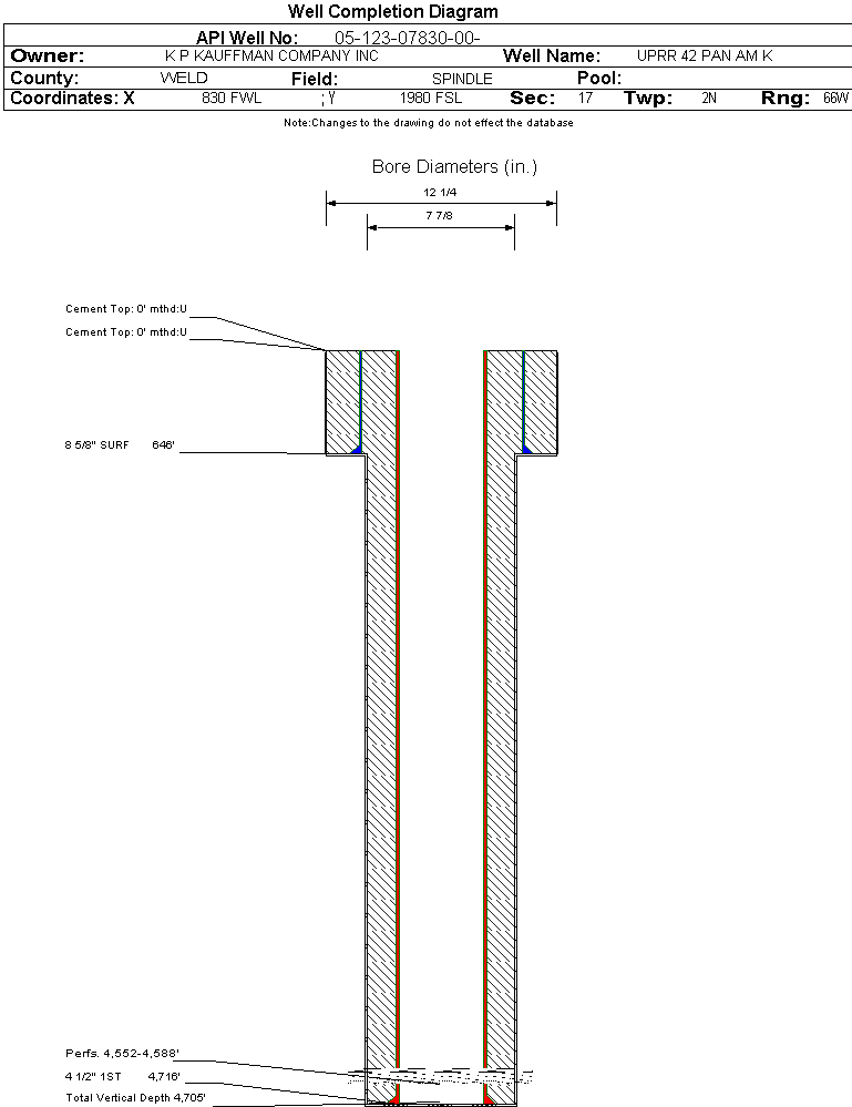 | Wellbore Completed | | Completion Date: | 11/20/1973 | | Spud Date: | 10/25/1973 | Spud Date Is: | ACTUAL | | Measured TD: | 4705 ft. | Measured PB depth: | 4672 ft. | | True Vertical TD: | 0 ft. | True Vertical PB depth: | | | Log Types: | SP-IES, FDC-GR CALIPER | | Casing: | String Type: SURF, Hole Size: 12.25 in., Size: 8.625 in., Top: 0 ft., Depth: 646 ft., Weight: 24 , Citings Type: ACTUAL | | Cement: | Sacks: 450, Top: 0 ft., Bottom: , Determination Method: | | Casing: | String Type: 1ST, Hole Size: 7.875 in., Size: 4.5 in., Top: 0 ft., Depth: 4716 ft., Weight: 10.5 , Citings Type: ACTUAL | | Cement: | Sacks: 200, Top: 0 ft., Bottom: , Determination Method: | | Formation | Interval Top | Log Bottom | Cored | DSTs | | SUSSEX | 4550 ft. | | | |