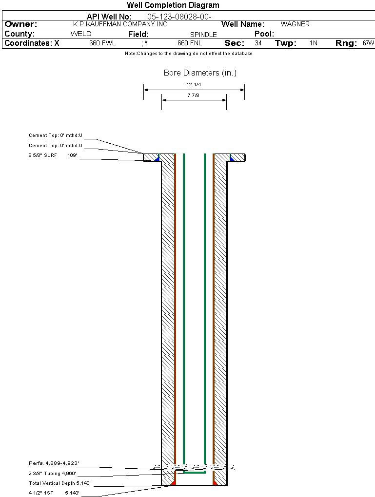 | Wellbore Completed | | Completion Date: | 3/19/1974 | | Spud Date: | 2/8/1974 | Spud Date Is: | ACTUAL | | Measured TD: | 5140 ft. | Measured PB depth: | 5088 ft. | | True Vertical TD: | | True Vertical PB depth: | | | Log Types: | IES-FDC/GR | | Casing: | String Type: SURF, Hole Size: 12.25 in., Size: 8.625 in., Top: 0 ft., Depth: 109 ft., Weight: 24 , Citings Type: ACTUAL | | Cement: | Sacks: 80, Top: 0 ft., Bottom: , Determination Method: | | Casing: | String Type: 1ST, Hole Size: 7.875 in., Size: 4.5 in., Top: 0 ft., Depth: 5140 ft., Weight: 11.6 , Citings Type: ACTUAL | | Cement: | Sacks: 200, Top: 0 ft., Bottom: , Determination Method: | | Formation | Interval Top | Log Bottom | Cored | DSTs | | SUSSEX | 4721 ft. | | | |