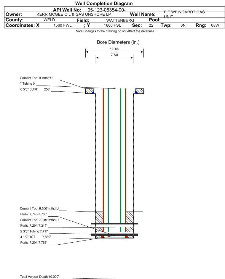 Wellbore #00 Wellbore Classification: OW Status: PA - 5/4/2017 Measured TD: 7880 ft.| Wellbore Data for Original Wellbore | Wellbore Classification: OW PA - 5/4/2017 | | Wellbore Permit | DRIFTED | | Permit #: | 19750215 | Expiration Date: | 7/19/1975 | | Proposed Depth/Form: | 7852 ft. | | Surface Mineral Owner Same: | No | | Mineral Owner: | FEE | Surface Owner: | Not available | | Unit: | | Unit Number: | | | Formation And Spacing: | Code: J-CDL , Formation: J-CODELL , Order: 407-66 , Unit Acreage: 320, Drill Unit: |