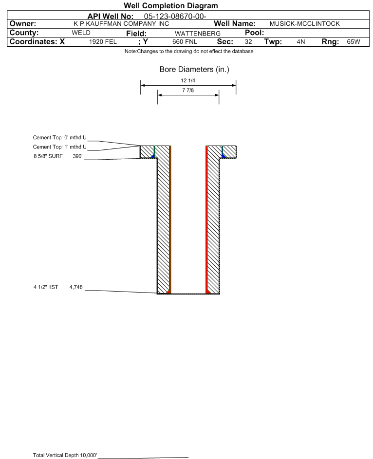 | Wellbore Completed | | Completion Date: | 5/21/1976 | | Measured TD: | 4803 ft. | Measured PB depth: | 4702 ft. | | True Vertical TD: | 0 ft. | True Vertical PB depth: | | | Casing: | String Type: SURF, Hole Size: 12.25 in., Size: 8.625 in., Top: 0 ft., Depth: 390 ft., Weight: , Citings Type: HISTORICAL | | Cement: | Sacks: 310, Top: 1 ft., Bottom: , Determination Method: | | Casing: | String Type: 1ST, Hole Size: 7.875 in., Size: 4.5 in., Top: 0 ft., Depth: 4748 ft., Weight: , Citings Type: HISTORICAL | | Cement: | Sacks: 0, Top: 0 ft., Bottom: , Determination Method: | | Formation | Interval Top | Log Bottom | Cored | DSTs | | FOX HILLS BASE | 305 ft. | | | | | SUSSEX | 4570 ft. | | | |
