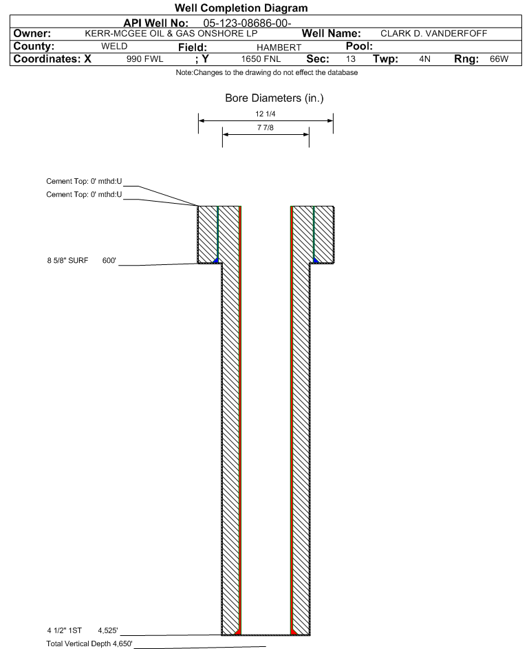 | Wellbore Completed | | Completion Date: | 5/21/1976 | | Measured TD: | 4650 ft. | Measured PB depth: | 4523 ft. | | True Vertical TD: | 4650 ft. | True Vertical PB depth: | | | Casing: | String Type: SURF, Hole Size: 12.25 in., Size: 8.625 in., Top: 0 ft., Depth: 600 ft., Weight: , Citings Type: HISTORICAL | | Cement: | Sacks: 0, Top: 0 ft., Bottom: , Determination Method: | | Casing: | String Type: 1ST, Hole Size: 7.875 in., Size: 4.5 in., Top: 0 ft., Depth: 4525 ft., Weight: , Citings Type: HISTORICAL | | Cement: | Sacks: 0, Top: 0 ft., Bottom: , Determination Method: | | Formation | Interval Top | Log Bottom | Cored | DSTs | | FOX HILLS BASE | 550 ft. | | | |