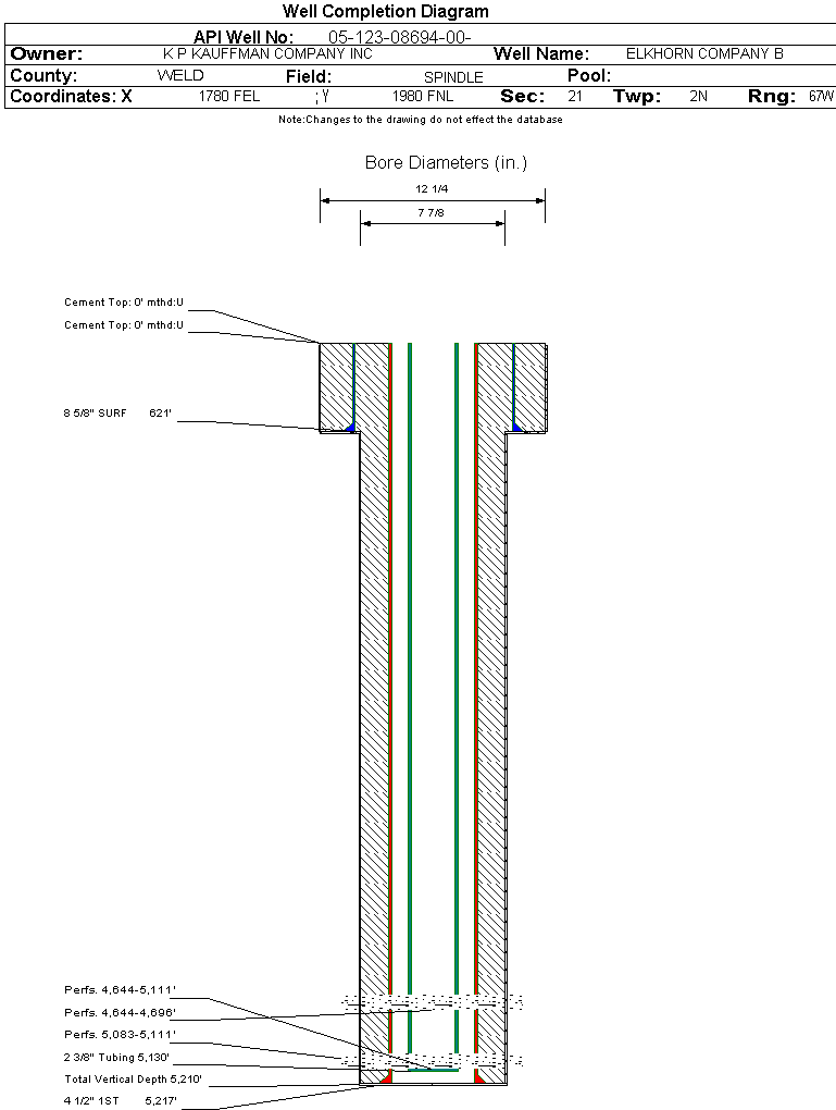| Wellbore Completed | | Completion Date: | 8/19/1976 | | Spud Date: | 5/5/1976 | Spud Date Is: | ACTUAL | | Measured TD: | 5210 ft. | Measured PB depth: | 5172 ft. | | True Vertical TD: | | True Vertical PB depth: | | | Log Types: | SP-IES, FDC-GR CALIPER | | Casing: | String Type: SURF, Hole Size: 12.25 in., Size: 8.625 in., Top: , Depth: 621 ft., Weight: 24 , Citings Type: ACTUAL | | Cement: | Sacks: 550, Top: , Bottom: , Determination Method: | | Casing: | String Type: 1ST, Hole Size: 7.875 in., Size: 4.5 in., Top: , Depth: 5217 ft., Weight: 10.5 , Citings Type: ACTUAL | | Cement: | Sacks: 300, Top: , Bottom: , Determination Method: | | Formation | Interval Top | Log Bottom | Cored | DSTs | | FOX HILLS BASE | 582 ft. | | N | N | | SUSSEX | 4622 ft. | | N | N | | SHANNON | 5080 ft. | | N | N |