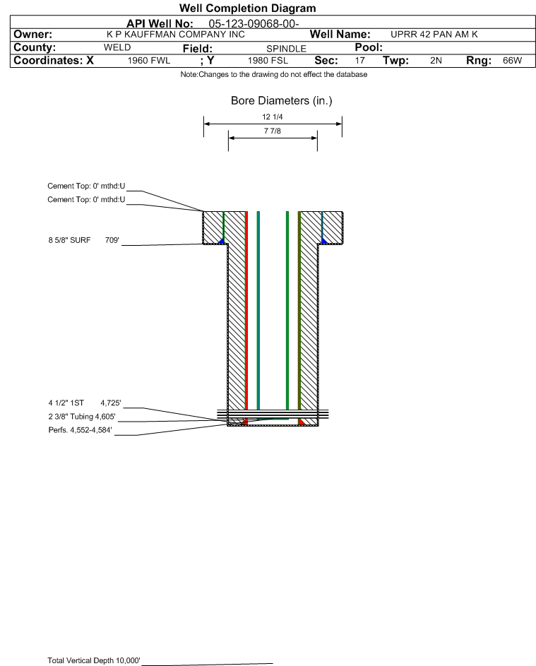 | | Tubing Size: | 2.375 in. | Tubing Setting Depth: | 4605 ft. | | Tubing Packer Depth: | | Tubing Multiple Packer: | | | Open Hole Top: | | Open Hole Bottom: | | | Initial Test Data: | | Test Date: | 1/19/1977 | Test Method: | PUMPING | | Hours Tested: | 24 | Gas Type: | | | Gas Disposal: | | |