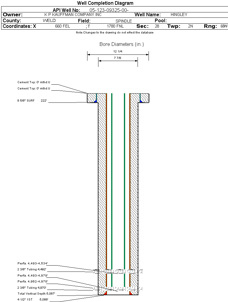 | | Tubing Size: | 2.375 in. | Tubing Setting Depth: | 4970 ft. | | Tubing Packer Depth: | | Tubing Multiple Packer: | | | Open Hole Top: | | Open Hole Bottom: | | | Initial Test Data: | | Test Date: | 4/4/1978 | Test Method: | PUMPING | | Hours Tested: | 24 | Gas Type: | | | Gas Disposal: | SOLD | |