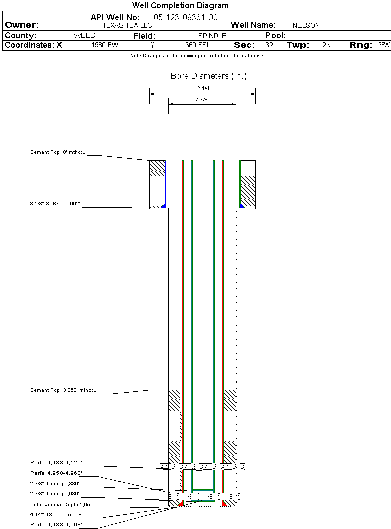 | | Perforation Data: | | Interval Top: | 4950 ft. | # Of Holes: | 30 | | Interval Bottom: | 4968 ft. | Hole Size: | |