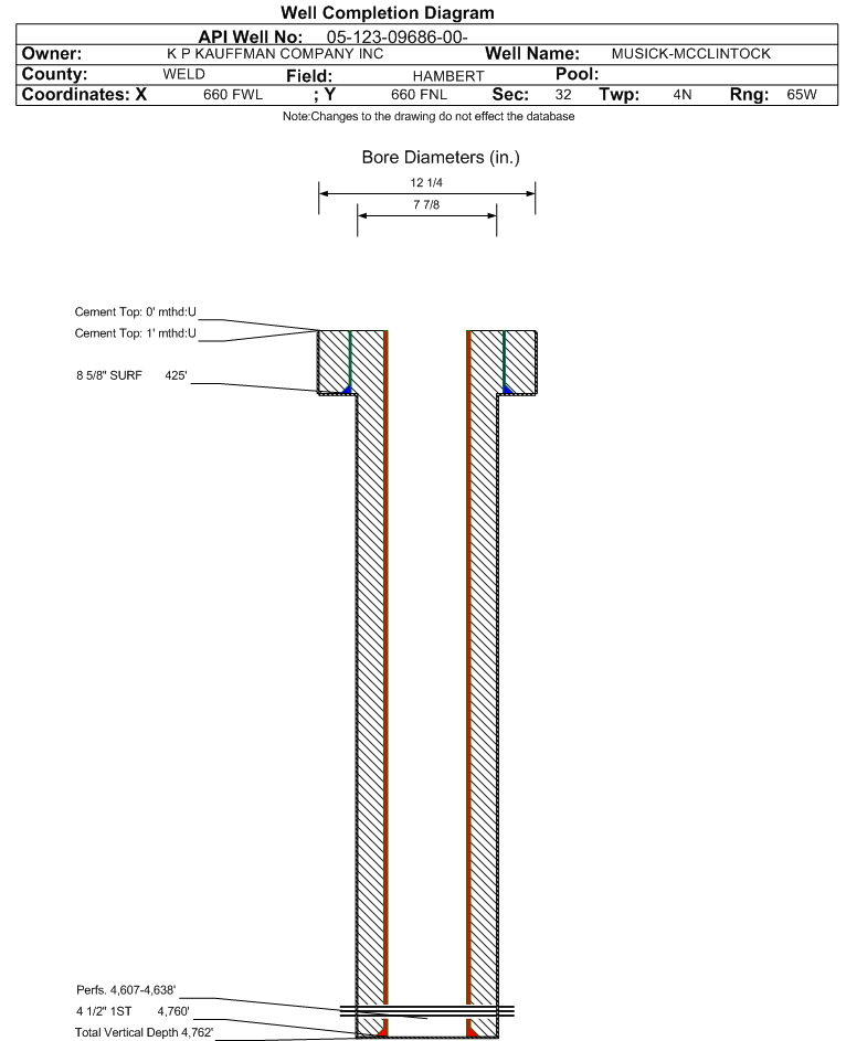 | Wellbore Completed | | Completion Date: | 7/24/1979 | | Measured TD: | 4762 ft. | Measured PB depth: | 4716 ft. | | True Vertical TD: | 4762 ft. | True Vertical PB depth: | | | Casing: | String Type: SURF, Hole Size: 12.25 in., Size: 8.625 in., Top: 0 ft., Depth: 425 ft., Weight: , Citings Type: HISTORICAL | | Cement: | Sacks: 300, Top: 1 ft., Bottom: , Determination Method: | | Casing: | String Type: 1ST, Hole Size: 7.875 in., Size: 4.5 in., Top: 0 ft., Depth: 4760 ft., Weight: , Citings Type: HISTORICAL | | Cement: | Sacks: 0, Top: 0 ft., Bottom: , Determination Method: | | Formation | Interval Top | Log Bottom | Cored | DSTs | | FOX HILLS BASE | 358 ft. | | | | | SUSSEX | 4510 ft. | | | |