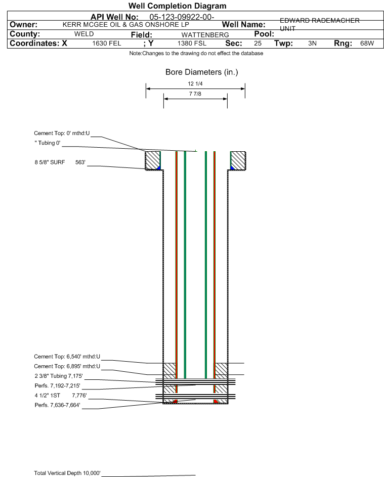 | Wellbore Completed | | Completion Date: | 11/24/1980 | | Spud Date: | 6/19/1980 | Spud Date Is: | ACTUAL | | Measured TD: | 7776 ft. | Measured PB depth: | 7723 ft. | | True Vertical TD: | | True Vertical PB depth: | | | Log Types: | SP-IES, FDC-GR CALIPER LOG, CBL | | Casing: | String Type: SURF, Hole Size: 12.25 in., Size: 8.625 in., Top: , Depth: 563 ft., Weight: 24 , Citings Type: ACTUAL | | Cement: | Sacks: 400, Top: 0 ft., Bottom: 563 ft., Determination Method: VISU | | Casing: | String Type: 1ST, Hole Size: 7.875 in., Size: 4.5 in., Top: , Depth: 7776 ft., Weight: 11.6 , Citings Type: ACTUAL | | Cement: | Sacks: 200, Top: 6540 ft., Bottom: 7776 ft., Determination Method: CBL | | Casing: | String Type: S.C. 1.1, Hole Size: , Size: , Top: , Depth: 6896 ft., Weight: , Citings Type: ACTUAL | | Cement: | Sacks: 75, Top: 6895 ft., Bottom: 6896 ft., Determination Method: CBL | | Formation | Interval Top | Log Bottom | Cored | DSTs | | SUSSEX | 4150 ft. | | N | N | | SHANNON | 4620 ft. | | N | N | | NIOBRARA | 6922 ft. | | N | N | | CODELL | 7196 ft. | | N | N | | BENTONITE | 7460 ft. | | N | N | | J SAND | 7626 ft. | | N | N |