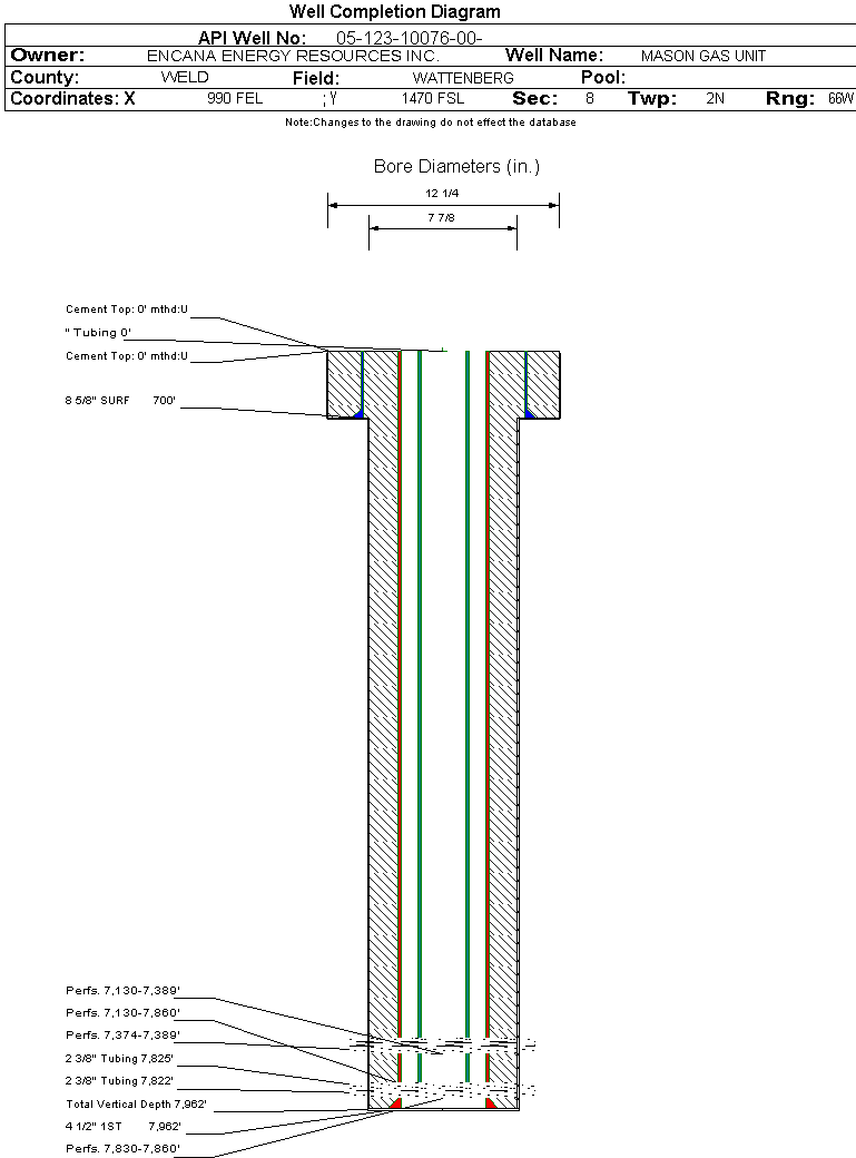 | | Perforation Data: | | Interval Top: | 7130 ft. | # Of Holes: | 150 | | Interval Bottom: | 7860 ft. | Hole Size: | 0.38 in. |