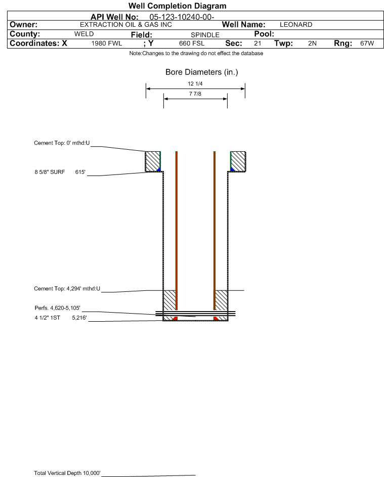 | | Perforation Data: | | Interval Top: | 4620 ft. | # Of Holes: | | | Interval Bottom: | 5105 ft. | Hole Size: | |