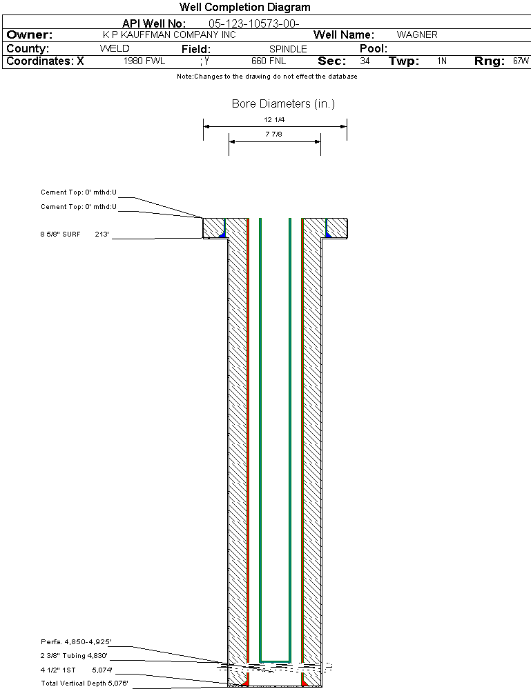 | Wellbore Completed | | Completion Date: | 3/1/1982 | | Spud Date: | 1/28/1982 | Spud Date Is: | ACTUAL | | Measured TD: | 5076 ft. | Measured PB depth: | 5056 ft. | | True Vertical TD: | | True Vertical PB depth: | | | Log Types: | COMPENSATED DENSITY | | Casing: | String Type: SURF, Hole Size: 12.25 in., Size: 8.625 in., Top: 0 ft., Depth: 213 ft., Weight: 24 , Citings Type: ACTUAL | | Cement: | Sacks: 170, Top: 0 ft., Bottom: , Determination Method: | | Casing: | String Type: 1ST, Hole Size: 7.875 in., Size: 4.5 in., Top: 0 ft., Depth: 5074 ft., Weight: 11.6 , Citings Type: ACTUAL | | Cement: | Sacks: 100, Top: 0 ft., Bottom: , Determination Method: | | Formation | Interval Top | Log Bottom | Cored | DSTs | | FOX HILLS BASE | 800 ft. | | | | | SUSSEX | 4840 ft. | | | |