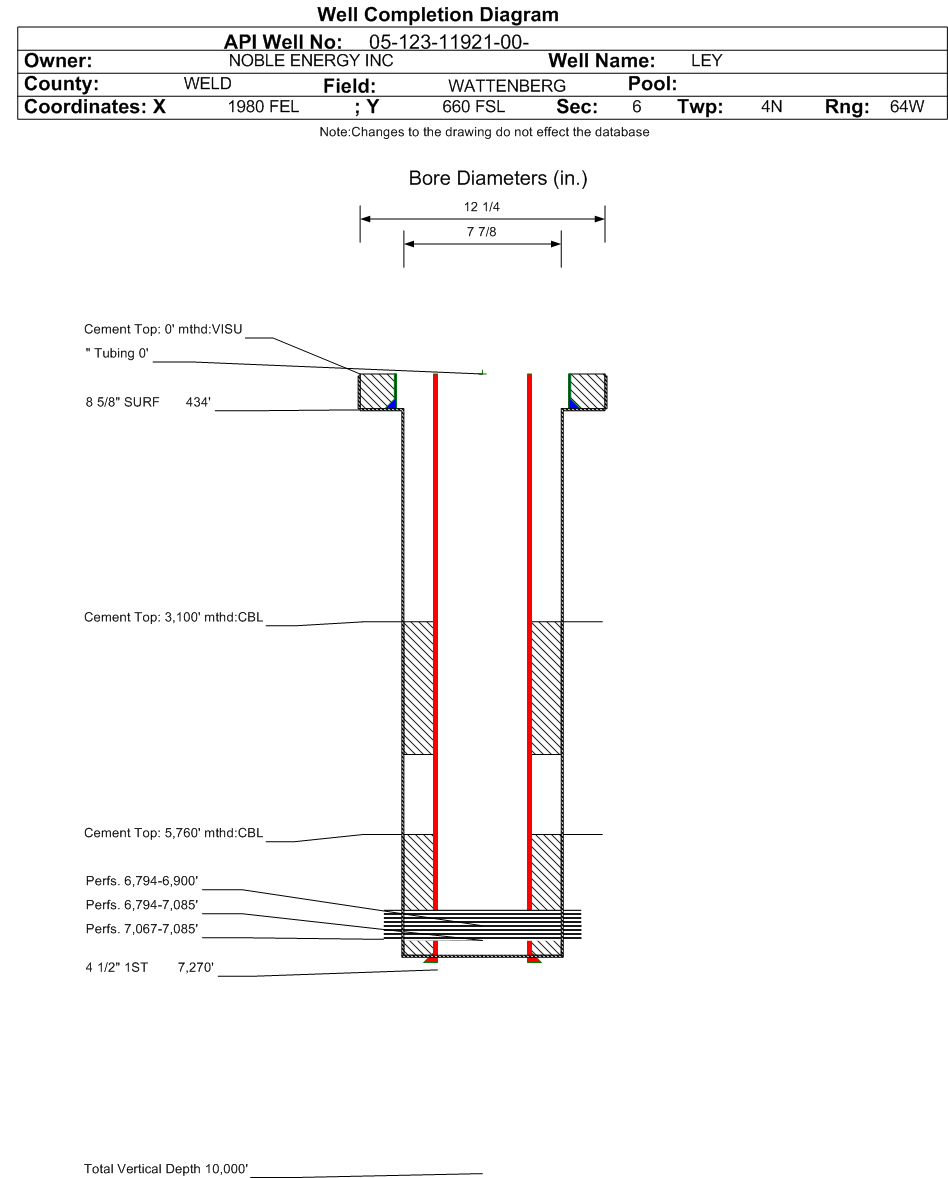 | Wellbore Completed | | Completion Date: | 8/9/1984 | | Spud Date: | 8/4/1984 | Spud Date Is: | ACTUAL | | Measured TD: | 7280 ft. | Measured PB depth: | 7164 ft. | | True Vertical TD: | | True Vertical PB depth: | | | Log Types: | IEL, CDL, GR, CEMENT BOND | | Log Types: | | | Casing: | String Type: SURF, Hole Size: 12.25 in., Size: 8.625 in., Top: 0 ft., Depth: 434 ft., Weight: 24 , Citings Type: ACTUAL | | Cement: | Sacks: 300, Top: 0 ft., Bottom: 434 ft., Determination Method: VISU | | Casing: | String Type: 1ST, Hole Size: 7.875 in., Size: 4.5 in., Top: 0 ft., Depth: 7270 ft., Weight: 10.5 , Citings Type: ACTUAL | | Cement: | Sacks: 250, Top: 5760 ft., Bottom: 7270 ft., Determination Method: CBL | | Casing: | String Type: S.C. 1.1, Hole Size: , Size: , Top: , Depth: 4736 ft., Weight: , Citings Type: ACTUAL | | Cement: | Sacks: 430, Top: 3100 ft., Bottom: 4760 ft., Determination Method: CBL | | Formation | Interval Top | Log Bottom | Cored | DSTs | | SUSSEX | 4348 ft. | | N | N | | NIOBRARA | 6793 ft. | | N | N | | CODELL | 7068 ft. | | N | N | | TIMPAS | 7094 ft. | | N | N |