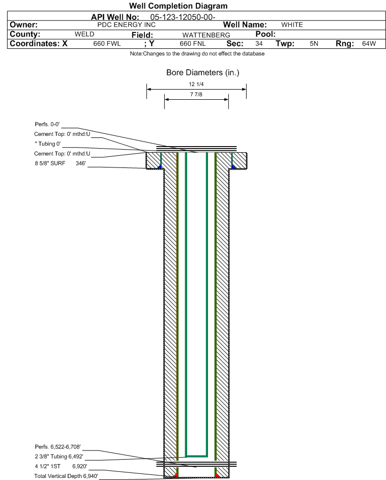 | Wellbore Completed | | Completion Date: | 12/15/1984 | | Spud Date: | 11/2/1984 | Spud Date Is: | ACTUAL | | Measured TD: | 6940 ft. | Measured PB depth: | 0 ft. | | True Vertical TD: | 6940 ft. | True Vertical PB depth: | | | Casing: | String Type: SURF, Hole Size: 12.25 in., Size: 8.625 in., Top: 0 ft., Depth: 346 ft., Weight: 24 , Citings Type: ACTUAL | | Cement: | Sacks: 300, Top: 0 ft., Bottom: 346 ft., Determination Method: VISU | | Casing: | String Type: 1ST, Hole Size: 7.875 in., Size: 4.5 in., Top: 0 ft., Depth: 6920 ft., Weight: 11.6 , Citings Type: ACTUAL | | Cement: | Sacks: 230, Top: 5856 ft., Bottom: 6920 ft., Determination Method: CBL | | Formation | Interval Top | Log Bottom | Cored | DSTs | | SUSSEX | 4270 ft. | | | | | SHANNON | 5452 ft. | | | | | NIOBRARA | 6520 ft. | | | | | FORT HAYS | 6768 ft. | | | | | CODELL | 6805 ft. | | | | | GREENHORN | 6865 ft. | | | |