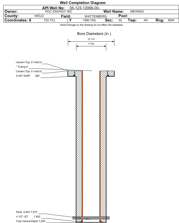 Wellbore #00 Wellbore Classification: GW Status: PA - 12/8/2023 Measured TD: 7400 ft. Vertical TD: 7400 ft.| Wellbore Data for Original Wellbore | Wellbore Classification: GW PA - 12/8/2023 | | Wellbore Permit | DRIFTED | | Permit #: | 841546 | Expiration Date: | 2/21/1985 | | Proposed Depth/Form: | | | Surface Mineral Owner Same: | Not available | | Mineral Owner: | FEE | Surface Owner: | Not available | | Unit: | | Unit Number: | | | Formation And Spacing: | Code: NB-CD , Formation: NIOBRARA-CODELL , Order: 0 , Unit Acreage: 0, Drill Unit: |