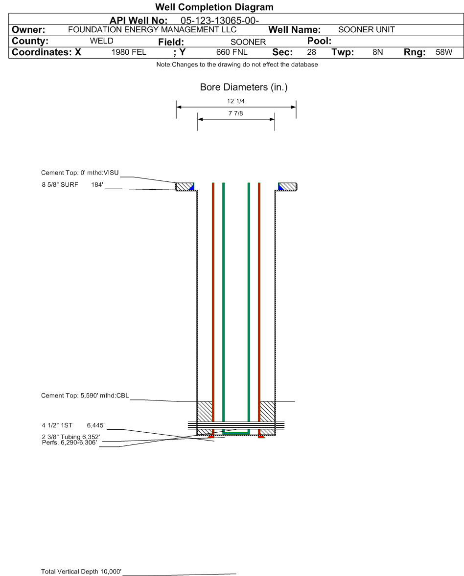 Wellbore #00 Wellbore Classification: OW Status: PA - 3/27/2019 Measured TD: 6445 ft. Vertical TD: 0 ft.| Wellbore Data for Original Wellbore | Wellbore Classification: OW PA - 3/27/2019 | | Wellbore Permit | | | Permit #: | 19860332 | Expiration Date: | 9/17/1986 | | Proposed Depth/Form: | 6400 ft. | | Surface Mineral Owner Same: | Yes | | Mineral Owner: | FEE | Surface Owner: | FEE | | Unit: | SOONER | Unit Number: | | | Formation And Spacing: | Code: DSND , Formation: D SAND , Order: 0 , Unit Acreage: 40, Drill Unit: NWNE |