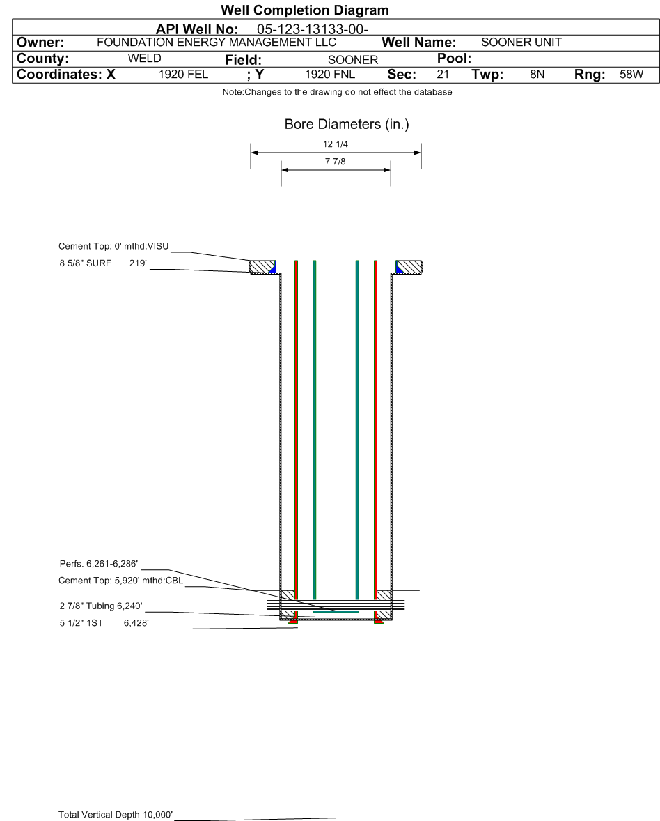 Wellbore #00 Wellbore Classification: ERIW Status: PA - 6/2/2020 Measured TD: 6428 ft.| Wellbore Data for Original Wellbore | Wellbore Classification: ERIW PA - 6/2/2020 | | Wellbore Permit | | | Permit #: | 19860529 | Expiration Date: | 12/16/1986 | | Proposed Depth/Form: | 6455 ft. | | Surface Mineral Owner Same: | No | | Mineral Owner: | FEDERAL | Surface Owner: | FEE | | Unit: | SOONER | Unit Number: | | | Formation And Spacing: | Code: DSND , Formation: D SAND , Order: 0 , Unit Acreage: 40, Drill Unit: SWNE |