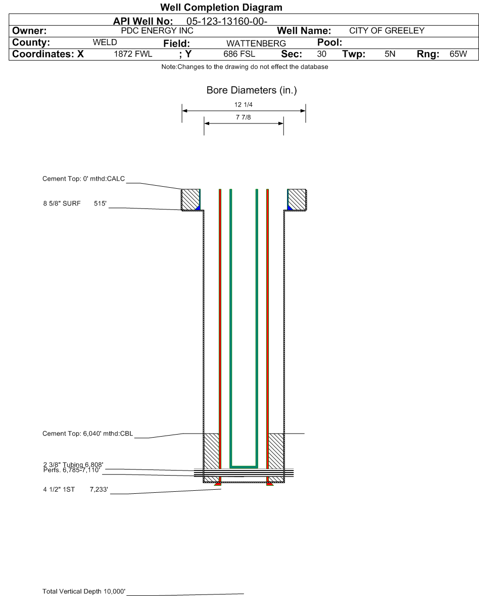 | Wellbore Completed | | Completion Date: | 10/5/1986 | | Spud Date: | 9/29/1986 | Spud Date Is: | ACTUAL | | Measured TD: | 7233 ft. | Measured PB depth: | 7196 ft. | | True Vertical TD: | | True Vertical PB depth: | | | Log Types: | SBL-GR-CCL run 6/17/2010 for SUSX squeeze. | | Casing: | String Type: SURF, Hole Size: 12.25 in., Size: 8.625 in., Top: 0 ft., Depth: 515 ft., Weight: 24 , Citings Type: ACTUAL | | Cement: | Sacks: 360, Top: 0 ft., Bottom: 515 ft., Determination Method: VISU | | Casing: | String Type: 1ST, Hole Size: 7.875 in., Size: 4.5 in., Top: 0 ft., Depth: 7233 ft., Weight: 11.6 , Citings Type: ACTUAL | | Cement: | Sacks: 230, Top: 6035 ft., Bottom: 7233 ft., Determination Method: CBL | | Casing: | String Type: S.C. 1.1, Hole Size: 7.875 in., Size: 4.5 in., Top: , Depth: 4650 ft., Weight: 11.6 , Citings Type: ACTUAL | | Cement: | Sacks: 200, Top: 3926 ft., Bottom: 4666 ft., Determination Method: CBL | | Formation | Interval Top | Log Bottom | Cored | DSTs | | FOX HILLS | 100 ft. | | | | | SUSSEX | 4270 ft. | | | | | NIOBRARA | 6778 ft. | | | | | FORT HAYS | 7070 ft. | | | | | CODELL | 7092 ft. | | | | | GREENHORN | 7165 ft. | | | |