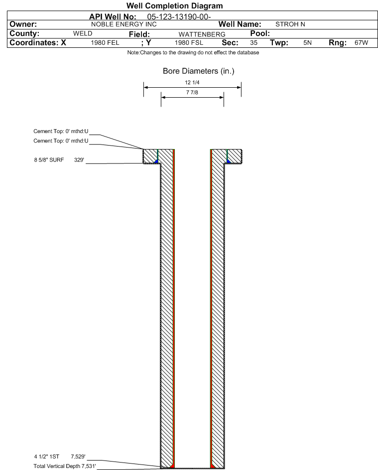 | Wellbore Completed | | Completion Date: | 11/20/1986 | | Measured TD: | 7531 ft. | Measured PB depth: | 7518 ft. | | True Vertical TD: | 7531 ft. | True Vertical PB depth: | | | Casing: | String Type: SURF, Hole Size: 12.25 in., Size: 8.625 in., Top: 0 ft., Depth: 322 ft., Weight: 24 , Citings Type: ACTUAL | | Cement: | Sacks: 215, Top: 0 ft., Bottom: 322 ft., Determination Method: VISU | | Casing: | String Type: 1ST, Hole Size: 7.875 in., Size: 4.5 in., Top: 0 ft., Depth: 7529 ft., Weight: 15.1 , Citings Type: ACTUAL | | Cement: | Sacks: 230, Top: 6632 ft., Bottom: 7529 ft., Determination Method: CBL | | Formation | Interval Top | Log Bottom | Cored | DSTs | | NIOBRARA | 7046 ft. | | | | | CODELL | 7368 ft. | | | |