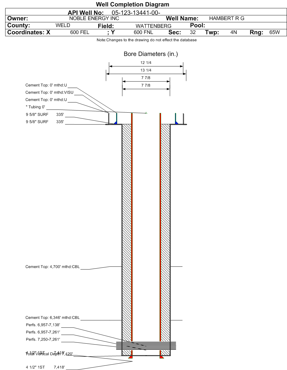 | Wellbore Completed | | Completion Date: | 8/12/1987 | | Measured TD: | 7420 ft. | Measured PB depth: | 7418 ft. | | True Vertical TD: | 7420 ft. | True Vertical PB depth: | | | Casing: | String Type: SURF, Hole Size: 12.25 in., Size: 9.625 in., Top: , Depth: 335 ft., Weight: 36 , Citings Type: ACTUAL | | Cement: | Sacks: 175, Top: 0 ft., Bottom: 335 ft., Determination Method: VISU | | Casing: | String Type: SURF, Hole Size: 13.25 in., Size: 9.625 in., Top: 0 ft., Depth: 335 ft., Weight: , Citings Type: HISTORICAL | | Cement: | Sacks: 0, Top: 0 ft., Bottom: , Determination Method: | | Casing: | String Type: 1ST, Hole Size: 7.875 in., Size: 4.5 in., Top: , Depth: 7418 ft., Weight: 15.10 , Citings Type: ACTUAL | | Cement: | Sacks: 230, Top: 6346 ft., Bottom: 7418 ft., Determination Method: CBL | | Casing: | String Type: 1ST, Hole Size: 7.875 in., Size: 4.5 in., Top: 0 ft., Depth: 7418 ft., Weight: , Citings Type: HISTORICAL | | Cement: | Sacks: 0, Top: 0 ft., Bottom: , Determination Method: | | Casing: | String Type: S.C. 1.1, Hole Size: , Size: , Top: , Depth: 7418 ft., Weight: , Citings Type: ACTUAL | | Cement: | Sacks: 200, Top: 4250 ft., Bottom: 4800 ft., Determination Method: CBL | | Formation | Interval Top | Log Bottom | Cored | DSTs | | FOX HILLS | 1570 ft. | | | | | SUSSEX | 4456 ft. | | | | | NIOBRARA | 6954 ft. | | | | | FORT HAYS | 7225 ft. | | | | | CODELL | 7248 ft. | | | | | CARLILE | 7263 ft. | | | | | GREENHORN | 7307 ft. | | | |