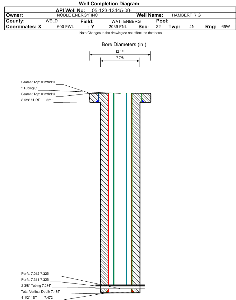 | Wellbore Completed | | Completion Date: | 8/7/1987 | | Measured TD: | 7485 ft. | Measured PB depth: | 7472 ft. | | True Vertical TD: | 7485 ft. | True Vertical PB depth: | | | Casing: | String Type: SURF, Hole Size: 12.25 in., Size: 8.625 in., Top: , Depth: 321 ft., Weight: 24 , Citings Type: ACTUAL | | Cement: | Sacks: 175, Top: 0 ft., Bottom: 321 ft., Determination Method: VISU | | Casing: | String Type: SURF, Hole Size: 12.25 in., Size: 8.625 in., Top: 0 ft., Depth: 321 ft., Weight: 24 , Citings Type: HISTORICAL | | Cement: | Sacks: 175, Top: 0 ft., Bottom: 321 ft., Determination Method: CALC | | Casing: | String Type: 1ST, Hole Size: 7.875 in., Size: 4.5 in., Top: , Depth: 7472 ft., Weight: 15.1 , Citings Type: ACTUAL | | Cement: | Sacks: 220, Top: 6601 ft., Bottom: 7472 ft., Determination Method: CBL | | Casing: | String Type: 1ST, Hole Size: 7.875 in., Size: 4.5 in., Top: 0 ft., Depth: 7472 ft., Weight: 11.6 , Citings Type: HISTORICAL | | Cement: | Sacks: 220, Top: 6600 ft., Bottom: 7472 ft., Determination Method: CBL | | Casing: | String Type: S.C. 1.1, Hole Size: , Size: , Top: , Depth: 4700 ft., Weight: , Citings Type: ACTUAL | | Cement: | Sacks: 200, Top: 4260 ft., Bottom: 4558 ft., Determination Method: CBL | | Casing: | String Type: S.C. 1.1, Hole Size: 7.875 in., Size: 4.5 in., Top: 0 ft., Depth: 7472 ft., Weight: 11.6 , Citings Type: HISTORICAL | | Cement: | Sacks: 200, Top: 4238 ft., Bottom: 4684 ft., Determination Method: CBL | | Formation | Interval Top | Log Bottom | Cored | DSTs | | FOX HILLS | 1593 ft. | | | | | SUSSEX | 4498 ft. | | | | | NIOBRARA | 7010 ft. | | | | | FORT HAYS | 7285 ft. | | | | | CODELL | 7309 ft. | | | | | CARLILE | 7325 ft. | | | | | GREENHORN | 7366 ft. | | | |
