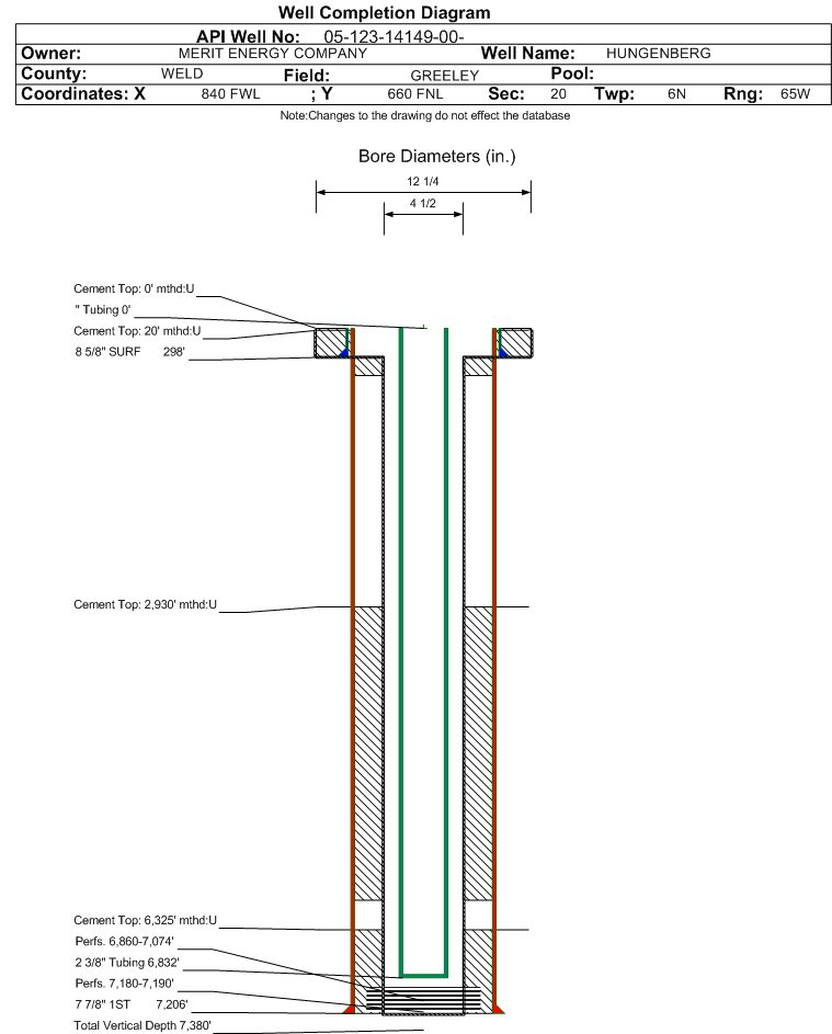 | Wellbore Completed | | Completion Date: | 12/2/1988 | | Spud Date: | 11/22/1988 | Spud Date Is: | ACTUAL | | Measured TD: | 7380 ft. | Measured PB depth: | 7206 ft. | | True Vertical TD: | 7380 ft. | True Vertical PB depth: | 7206 ft. | | Log Types: | CBL | | Casing: | String Type: SURF, Hole Size: 12.25 in., Size: 8.625 in., Top: 0 ft., Depth: 298 ft., Weight: , Citings Type: ACTUAL | | Cement: | Sacks: 230, Top: 0 ft., Bottom: 298 ft., Determination Method: | | Casing: | String Type: 1ST, Hole Size: 4.5 in., Size: 7.875 in., Top: 0 ft., Depth: 7206 ft., Weight: , Citings Type: ACTUAL | | Cement: | Sacks: 270, Top: 6325 ft., Bottom: 7206 ft., Determination Method: | | Casing: | String Type: S.C. 1.1, Hole Size: , Size: , Top: , Depth: 6014 ft., Weight: , Citings Type: ACTUAL | | Cement: | Sacks: 600, Top: 2930 ft., Bottom: 6014 ft., Determination Method: CBL | | Casing: | String Type: S.C. 1.2, Hole Size: , Size: , Top: , Depth: 492 ft., Weight: , Citings Type: ACTUAL | | Cement: | Sacks: 520, Top: 20 ft., Bottom: 496 ft., Determination Method: CBL | | Additional Cement: | String Type: 1ST , Top: 20 ft., Depth: 6014 ft., Bottom: 6014 ft., Sacks: 1120, Method: SQUEEZE | | Formation | Interval Top | Log Bottom | Cored | DSTs | | PARKMAN | 3780 ft. | | N | N | | NIOBRARA | 6865 ft. | 7059 ft. | N | N | | FORT HAYS | 7140 ft. | | N | N | | CODELL | 7180 ft. | | N | N | | CARLILE | 7197 ft. | | N | N |