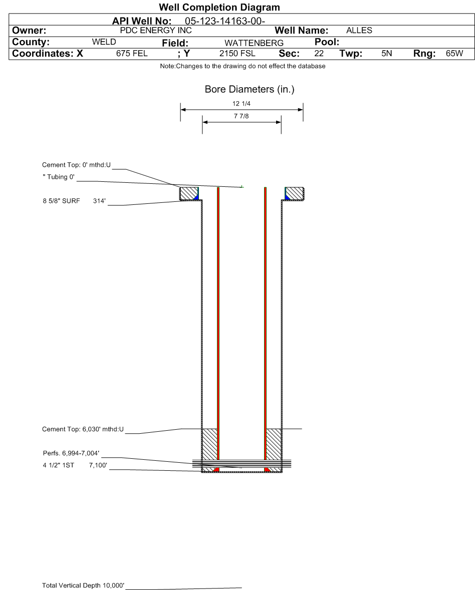 | | Perforation Data: | | Interval Top: | 6994 ft. | # Of Holes: | 100 | | Interval Bottom: | 7006 ft. | Hole Size: | 0.32 in. |