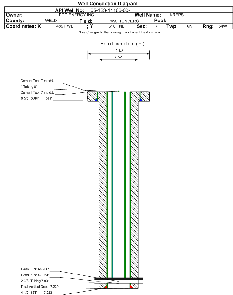 | Wellbore Completed | | Completion Date: | 12/19/1988 | | Measured TD: | 7230 ft. | Measured PB depth: | 7128 ft. | | True Vertical TD: | 7230 ft. | True Vertical PB depth: | | | Casing: | String Type: SURF, Hole Size: 12.25 in., Size: 8.625 in., Top: 0 ft., Depth: 329 ft., Weight: 24 , Citings Type: ACTUAL | | Cement: | Sacks: 175, Top: 0 ft., Bottom: 329 ft., Determination Method: VISU | | Casing: | String Type: 1ST, Hole Size: 7.875 in., Size: 4.5 in., Top: 0 ft., Depth: 7223 ft., Weight: 11.6 , Citings Type: ACTUAL | | Cement: | Sacks: 220, Top: 6285 ft., Bottom: 7223 ft., Determination Method: CBL | | Casing: | String Type: S.C. 1.1, Hole Size: , Size: , Top: , Depth: 5201 ft., Weight: , Citings Type: ACTUAL | | Cement: | Sacks: 200, Top: 800 ft., Bottom: 5201 ft., Determination Method: CBL | | Formation | Interval Top | Log Bottom | Cored | DSTs | | NIOBRARA | 6750 ft. | | | | | FORT HAYS | 7030 ft. | | | | | CODELL | 7046 ft. | | | |