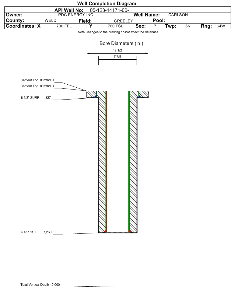 | Wellbore Completed | | Completion Date: | 12/30/1988 | | Spud Date: | 12/15/1988 | Spud Date Is: | ACTUAL | | Measured TD: | 7315 ft. | Measured PB depth: | 3758 ft. | | True Vertical TD: | 0 ft. | True Vertical PB depth: | | | Casing: | String Type: SURF, Hole Size: 12.25 in., Size: 8.625 in., Top: 0 ft., Depth: 327 ft., Weight: 24 , Citings Type: ACTUAL | | Cement: | Sacks: 175, Top: 0 ft., Bottom: 327 ft., Determination Method: VISU | | Casing: | String Type: 1ST, Hole Size: 7.875 in., Size: 4.5 in., Top: 0 ft., Depth: 7260 ft., Weight: 11.6 , Citings Type: ACTUAL | | Cement: | Sacks: 220, Top: 1150 ft., Bottom: 7260 ft., Determination Method: CBL | | Formation | Interval Top | Log Bottom | Cored | DSTs | | PARKMAN | 3668 ft. | | | | | NIOBRARA | 6693 ft. | | | | | FORT HAYS | 6978 ft. | | | | | CODELL | 7014 ft. | | | |