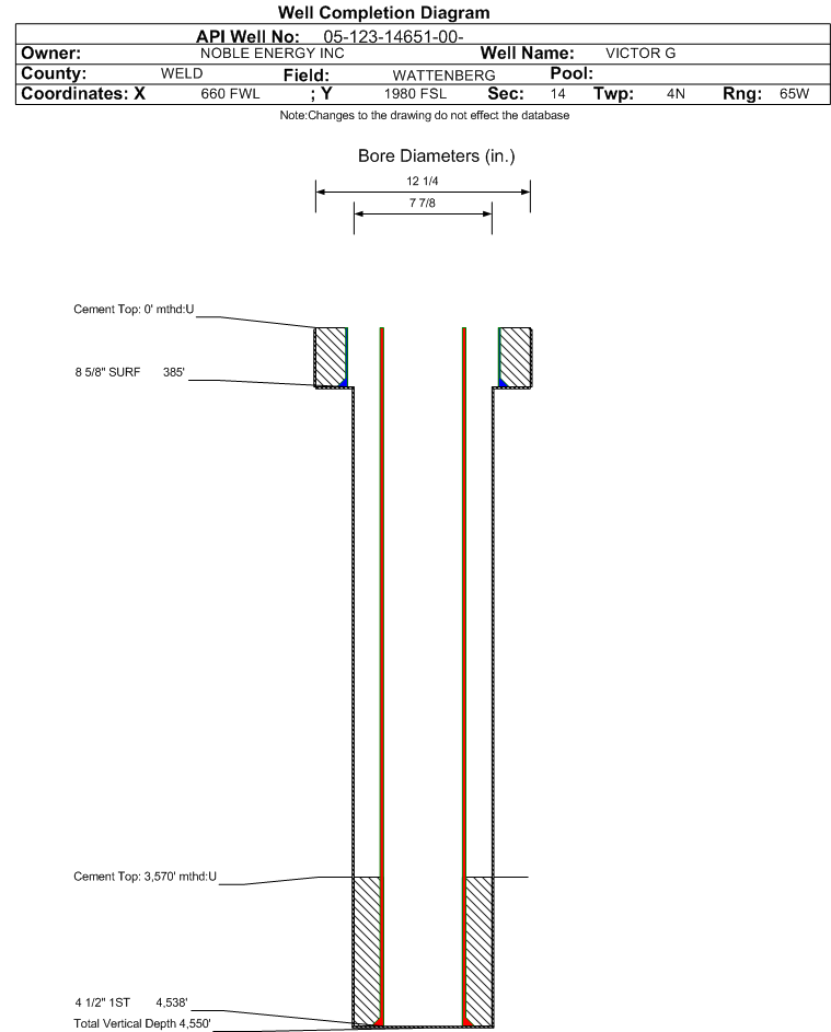 | Wellbore Completed | | Completion Date: | 11/30/1990 | | Measured TD: | 4550 ft. | Measured PB depth: | 4538 ft. | | True Vertical TD: | 4550 ft. | True Vertical PB depth: | | | Casing: | String Type: SURF, Hole Size: 12.25 in., Size: 8.625 in., Top: 0 ft., Depth: 385 ft., Weight: 24 , Citings Type: ACTUAL | | Cement: | Sacks: 270, Top: 0 ft., Bottom: 385 ft., Determination Method: VISU | | Casing: | String Type: 1ST, Hole Size: 7.875 in., Size: 4.5 in., Top: 0 ft., Depth: 4538 ft., Weight: 10.50 , Citings Type: ACTUAL | | Cement: | Sacks: 250, Top: 3570 ft., Bottom: 4538 ft., Determination Method: CBL | | Formation | Interval Top | Log Bottom | Cored | DSTs | | SUSSEX | 4380 ft. | | | |
