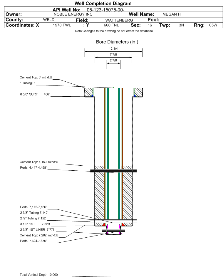 | Wellbore Completed | | Completion Date: | 7/20/1991 | | Spud Date: | 7/15/1991 | Spud Date Is: | ACTUAL | | Measured TD: | 7777 ft. | Measured PB depth: | 7313 ft. | | True Vertical TD: | | True Vertical PB depth: | | | Log Types: | MICROLOG, CFD-GR, GR/SONIC/COLLAR | | Log Types: | CBL | | Casing: | String Type: SURF, Hole Size: 12.25 in., Size: 8.625 in., Top: 0 ft., Depth: 466 ft., Weight: 24 , Citings Type: ACTUAL | | Cement: | Sacks: 240, Top: 0 ft., Bottom: 466 ft., Determination Method: VISU | | Casing: | String Type: 1ST, Hole Size: 7.875 in., Size: 3.5 in., Top: 0 ft., Depth: 7329 ft., Weight: 9.3 , Citings Type: ACTUAL | | Cement: | Sacks: 700, Top: 4150 ft., Bottom: 7329 ft., Determination Method: CBL | | Casing: | String Type: S.C. 1.1, Hole Size: 7.875 in., Size: 3.5 in., Top: 0 ft., Depth: 4447 ft., Weight: 9.3 , Citings Type: ACTUAL | | Cement: | Sacks: 200, Top: 4447 ft., Bottom: 4498 ft., Determination Method: CALC | | Casing: | String Type: S.C. 1.2, Hole Size: 7.875 in., Size: 3.5 in., Top: 0 ft., Depth: 3452 ft., Weight: 9.3 , Citings Type: ACTUAL | | Cement: | Sacks: 150, Top: 3120 ft., Bottom: 3471 ft., Determination Method: CALC | | Casing: | String Type: 1ST LINER, Hole Size: 2.875 in., Size: 2.375 in., Top: 7260 ft., Depth: 7776 ft., Weight: 4.7 , Citings Type: ACTUAL | | Cement: | Sacks: 4, Top: 7282 ft., Bottom: 7776 ft., Determination Method: CBL | | Additional Cement: | String Type: 1ST , Top: 4447 ft., Depth: , Bottom: 4498 ft., Sacks: 200, Method: SQUEEZE | | Additional Cement: | String Type: 1ST , Top: 3452 ft., Depth: , Bottom: 3471 ft., Sacks: 150, Method: SQUEEZE | | Formation | Interval Top | Log Bottom | Cored | DSTs | | SUSSEX | 4392 ft. | | N | N | | NIOBRARA | 6865 ft. | | N | N | | CODELL | 7170 ft. | | N | N | | J SAND | 7624 ft. | | | |