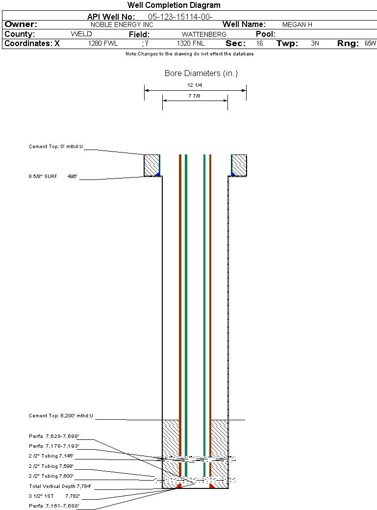 | Wellbore Completed | | Completion Date: | 9/13/1991 | | Spud Date: | 8/18/1991 | Spud Date Is: | ACTUAL | | Measured TD: | 7784 ft. | Measured PB depth: | 7779 ft. | | True Vertical TD: | 7784 ft. | True Vertical PB depth: | 7779 ft. | | Log Types: | CBL, CDL, DIL | | Casing: | String Type: SURF, Hole Size: 12.25 in., Size: 8.625 in., Top: 0 ft., Depth: 496 ft., Weight: 24 , Citings Type: ACTUAL | | Cement: | Sacks: 240, Top: 0 ft., Bottom: 496 ft., Determination Method: VISU | | Casing: | String Type: 1ST, Hole Size: 7.875 in., Size: 3.5 in., Top: 0 ft., Depth: 7592 ft., Weight: 9.3 , Citings Type: ACTUAL | | Cement: | Sacks: 950, Top: 3610 ft., Bottom: 7592 ft., Determination Method: CBL | | Formation | Interval Top | Log Bottom | Cored | DSTs | | SUSSEX | 4392 ft. | | N | N | | NIOBRARA | 6870 ft. | | N | N | | CODELL | 7178 ft. | | N | N | | J SAND | 7626 ft. | | N | N |