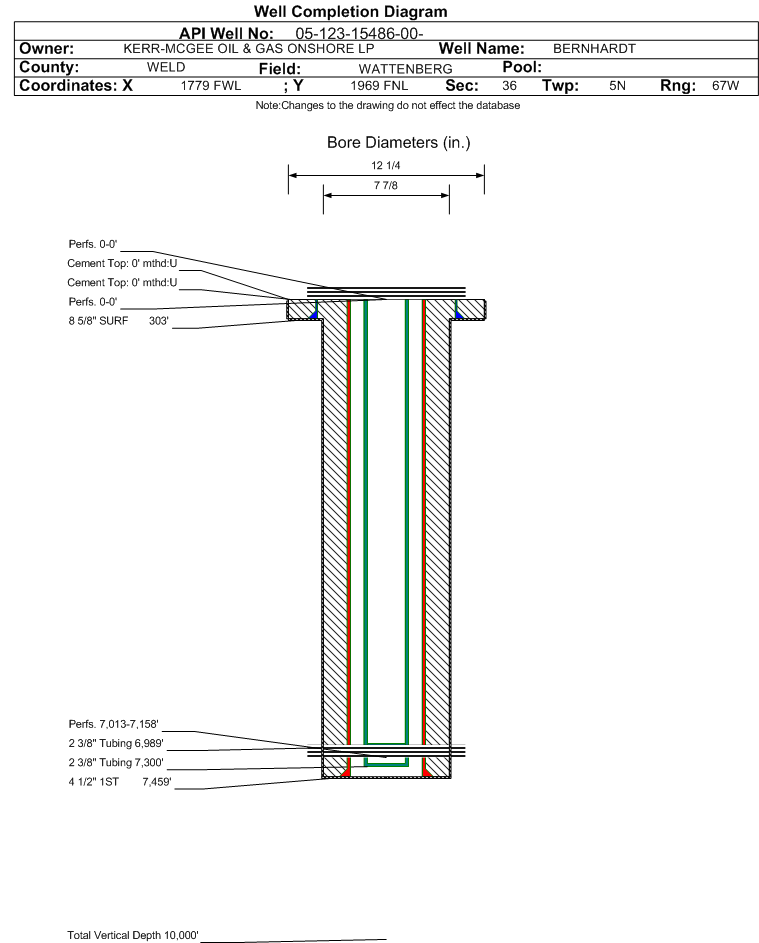 | Wellbore Completed | | Completion Date: | 1/6/1992 | | Measured TD: | 7459 ft. | Measured PB depth: | 7413 ft. | | True Vertical TD: | 0 ft. | True Vertical PB depth: | | | Casing: | String Type: SURF, Hole Size: 12.25 in., Size: 8.625 in., Top: 0 ft., Depth: 303 ft., Weight: 24 , Citings Type: ACTUAL | | Cement: | Sacks: 210, Top: 0 ft., Bottom: 303 ft., Determination Method: VISU | | Casing: | String Type: 1ST, Hole Size: 7.875 in., Size: 4.5 in., Top: 0 ft., Depth: 7459 ft., Weight: 11.6 , Citings Type: ACTUAL | | Cement: | Sacks: 175, Top: 6474 ft., Bottom: 7459 ft., Determination Method: CBL | | Formation | Interval Top | Log Bottom | Cored | DSTs | | NIOBRARA | 7013 ft. | | | | | CODELL | 7313 ft. | | | |