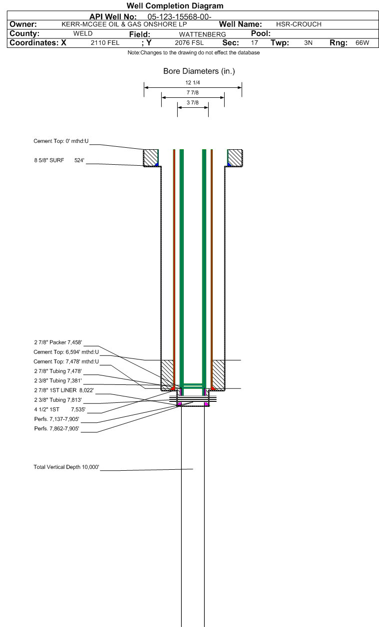 | Wellbore Completed | | Completion Date: | 4/6/2001 | | Spud Date: | 2/14/1992 | Spud Date Is: | ACTUAL | | Measured TD: | 8032 ft. | Measured PB depth: | 7990 ft. | | True Vertical TD: | | True Vertical PB depth: | | | Log Types: | DIL/SFL/GR; CBL; DEN/CNL/GR | | Log Types: | CDCNGR, IGRS, CBL | | Casing: | String Type: SURF, Hole Size: 12.25 in., Size: 8.625 in., Top: 0 ft., Depth: 524 ft., Weight: 24 , Citings Type: ACTUAL | | Cement: | Sacks: 360, Top: 0 ft., Bottom: 524 ft., Determination Method: CALC | | Casing: | String Type: 1ST, Hole Size: 7.875 in., Size: 4.5 in., Top: 0 ft., Depth: 7535 ft., Weight: 11.6 , Citings Type: ACTUAL | | Cement: | Sacks: 150, Top: 6594 ft., Bottom: 7535 ft., Determination Method: CBL | | Casing: | String Type: 1ST LINER, Hole Size: 3.875 in., Size: 2.875 in., Top: 7478 ft., Depth: 8022 ft., Weight: 6.5 , Citings Type: ACTUAL | | Cement: | Sacks: 35, Top: 7478 ft., Bottom: 8022 ft., Determination Method: CBL | | Formation | Interval Top | Log Bottom | Cored | DSTs | | NIOBRARA | 7136 ft. | | N | N | | FORT HAYS | 7392 ft. | | N | N | | CODELL | 7414 ft. | | N | N | | J SAND | 7860 ft. | | N | N |