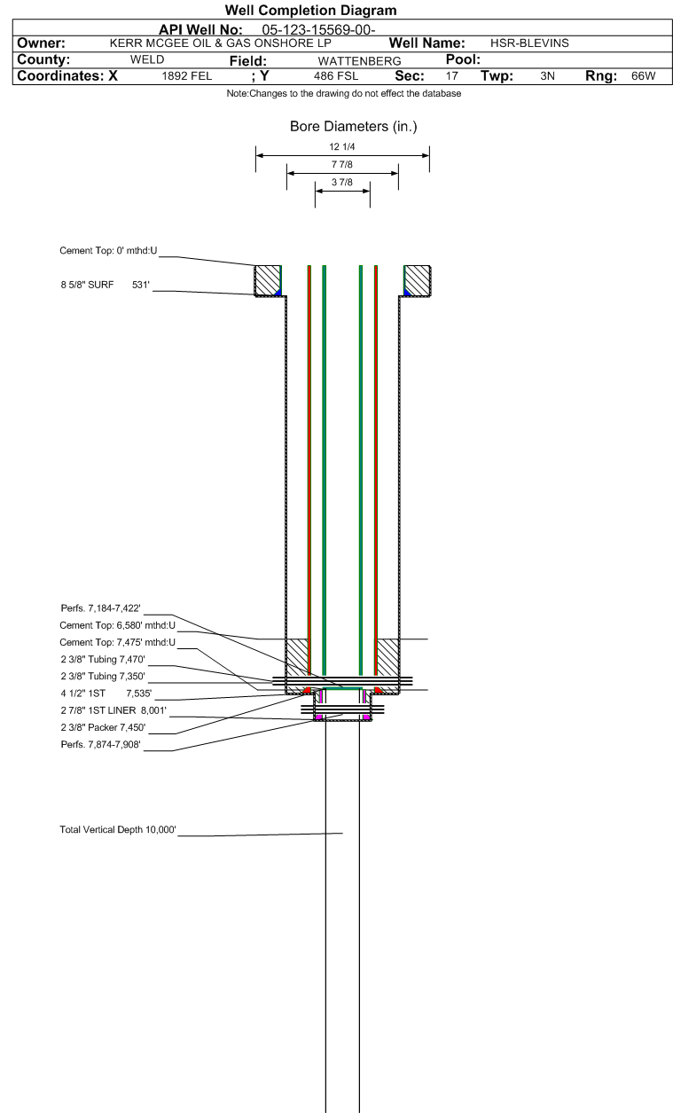 | Wellbore Completed | | Completion Date: | 1/12/2001 | | Spud Date: | 2/8/1992 | Spud Date Is: | ACTUAL | | Measured TD: | 8008 ft. | Measured PB depth: | | | True Vertical TD: | | True Vertical PB depth: | | | Log Types: | DIL/SFL/GR; CBL; DEN/CNL/GR | | Log Types: | CDCNGR,IGR,CBL. | | Casing: | String Type: SURF, Hole Size: 12.25 in., Size: 8.625 in., Top: 0 ft., Depth: 531 ft., Weight: 24 , Citings Type: ACTUAL | | Cement: | Sacks: 380, Top: 0 ft., Bottom: 531 ft., Determination Method: VISU | | Casing: | String Type: 1ST, Hole Size: 7.875 in., Size: 4.5 in., Top: 0 ft., Depth: 7535 ft., Weight: 11.6 , Citings Type: ACTUAL | | Cement: | Sacks: 140, Top: 6580 ft., Bottom: 7557 ft., Determination Method: CBL | | Casing: | String Type: 1ST LINER, Hole Size: 3.875 in., Size: 2.875 in., Top: 7470 ft., Depth: 8001 ft., Weight: 6.5 , Citings Type: ACTUAL | | Cement: | Sacks: 35, Top: 7475 ft., Bottom: 8008 ft., Determination Method: CBL | | Formation | Interval Top | Log Bottom | Cored | DSTs | | NIOBRARA | 7184 ft. | | N | N | | FORT HAYS | 7384 ft. | | N | N | | CODELL | 7405 ft. | | N | N | | J SAND | 7872 ft. | | N | N |