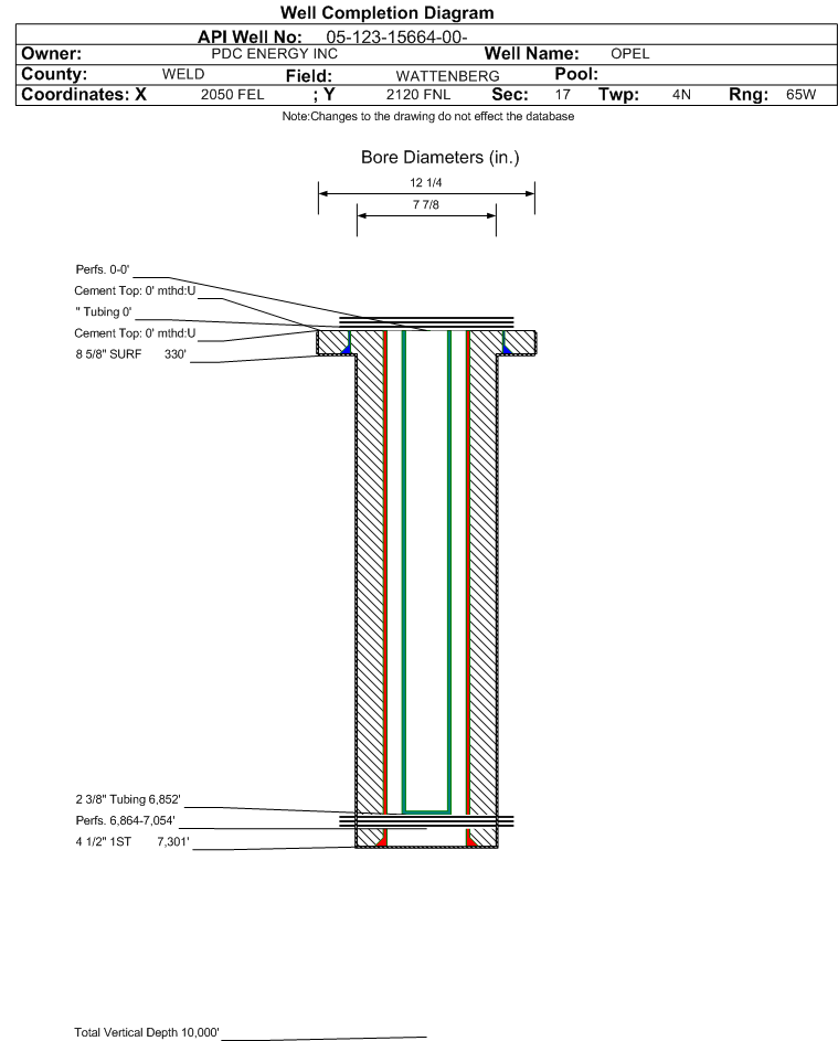 | Wellbore Completed | | Completion Date: | 4/23/1992 | | Measured TD: | 7307 ft. | Measured PB depth: | 7261 ft. | | True Vertical TD: | 0 ft. | True Vertical PB depth: | | | Casing: | String Type: SURF, Hole Size: 12.25 in., Size: 8.625 in., Top: 0 ft., Depth: 330 ft., Weight: , Citings Type: HISTORICAL | | Cement: | Sacks: 260, Top: 0 ft., Bottom: , Determination Method: | | Casing: | String Type: 1ST, Hole Size: 7.875 in., Size: 4.5 in., Top: 0 ft., Depth: 7301 ft., Weight: , Citings Type: HISTORICAL | | Cement: | Sacks: 0, Top: 0 ft., Bottom: , Determination Method: | | Formation | Interval Top | Log Bottom | Cored | DSTs | | CODELL | 7158 ft. | | | |