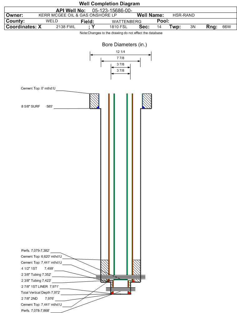 Wellbore #00 Wellbore Classification: GW Status: SI - 10/29/2025 Measured TD: 7976 ft. Vertical TD: 7972 ft.| Wellbore Data for Original Wellbore | Wellbore Classification: GW SI - 10/29/2025 | | Wellbore Permit | DRIFTED | | Permit #: | 19980680 | Expiration Date: | 7/26/1999 | | Proposed Depth/Form: | 8000 ft. | | Surface Mineral Owner Same: | No | | Mineral Owner: | FEE | Surface Owner: | FEE | | Unit: | | Unit Number: | | | Formation And Spacing: | Code: NB-CD , Formation: NIOBRARA-CODELL , Order: 318A , Unit Acreage: 80, Drill Unit: E2SW |