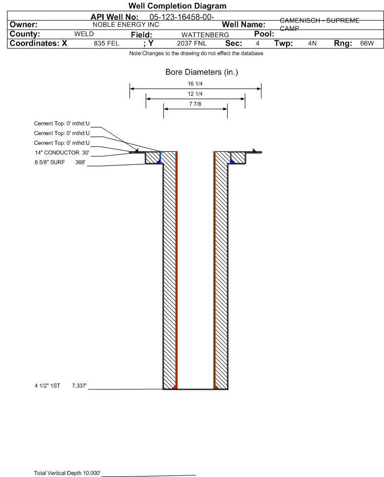 | Wellbore Completed | | Completion Date: | 2/24/1993 | | Measured TD: | 7340 ft. | Measured PB depth: | 7245 ft. | | True Vertical TD: | 0 ft. | True Vertical PB depth: | | | Casing: | String Type: CONDUCTOR, Hole Size: 16.5 in., Size: , Top: 0 ft., Depth: 30 ft., Weight: NA , Citings Type: ACTUAL | | Cement: | Sacks: 10, Top: 0 ft., Bottom: 30 ft., Determination Method: VISU | | Casing: | String Type: SURF, Hole Size: 12.25 in., Size: 8.625 in., Top: 0 ft., Depth: 368 ft., Weight: 24 , Citings Type: ACTUAL | | Cement: | Sacks: 100, Top: 0 ft., Bottom: 368 ft., Determination Method: VISU | | Casing: | String Type: 1ST, Hole Size: 7.875 in., Size: 4.5 in., Top: 0 ft., Depth: 7337 ft., Weight: 10.5 , Citings Type: ACTUAL | | Cement: | Sacks: 160, Top: 6526 ft., Bottom: 7337 ft., Determination Method: CBL | | Casing: | String Type: S.C. 1.1, Hole Size: 7.875 in., Size: 4.5 in., Top: 0 ft., Depth: 4896 ft., Weight: 10.5 , Citings Type: ACTUAL | | Cement: | Sacks: 250, Top: 4286 ft., Bottom: 4960 ft., Determination Method: CBL | | Formation | Interval Top | Log Bottom | Cored | DSTs | | SUSSEX | 4304 ft. | | | | | SHANNON | 4737 ft. | | | | | NIOBRARA | 6862 ft. | | | | | FORT HAYS | 7164 ft. | | | | | CODELL | 7185 ft. | | | | | CARLILE | 7203 ft. | | | |