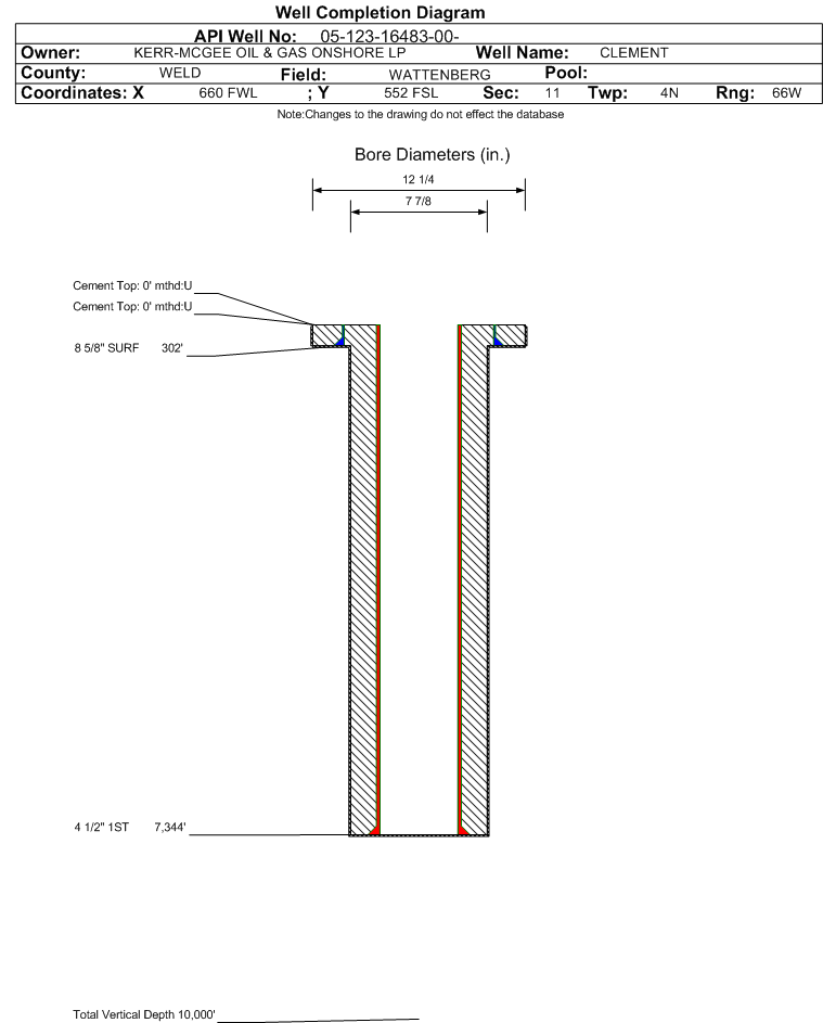 | Wellbore Completed | | Completion Date: | 12/31/1992 | | Measured TD: | 7349 ft. | Measured PB depth: | 7305 ft. | | True Vertical TD: | 0 ft. | True Vertical PB depth: | | | Top PZ Location: | Sec: Twp: | Footage: 0 FL 0 FL | | Casing: | String Type: SURF, Hole Size: 12.25 in., Size: 8.625 in., Top: 0 ft., Depth: 302 ft., Weight: 24 , Citings Type: ACTUAL | | Cement: | Sacks: 100, Top: 0 ft., Bottom: 302 ft., Determination Method: VISU | | Casing: | String Type: SURF, Hole Size: 12.25 in., Size: 8.625 in., Top: 0 ft., Depth: 302 ft., Weight: , Citings Type: HISTORICAL | | Cement: | Sacks: 100, Top: 0 ft., Bottom: , Determination Method: | | Casing: | String Type: 1ST, Hole Size: 7.875 in., Size: 4.5 in., Top: 0 ft., Depth: 7344 ft., Weight: 11.6 , Citings Type: ACTUAL | | Cement: | Sacks: 175, Top: 6080 ft., Bottom: 7344 ft., Determination Method: CBL | | Casing: | String Type: 1ST, Hole Size: 7.875 in., Size: 4.5 in., Top: 0 ft., Depth: 7344 ft., Weight: , Citings Type: HISTORICAL | | Cement: | Sacks: 0, Top: 0 ft., Bottom: , Determination Method: | | Casing: | String Type: S.C. 1.1, Hole Size: 7.875 in., Size: 4.5 in., Top: 0 ft., Depth: 7344 ft., Weight: 11.6 , Citings Type: ACTUAL | | Cement: | Sacks: 310, Top: 4220 ft., Bottom: 5200 ft., Determination Method: CBL | | Formation | Interval Top | Log Bottom | Cored | DSTs | | SUSSEX | 4386 ft. | | | | | NIOBRARA | 6880 ft. | | | | | CODELL | 7218 ft. | | | |