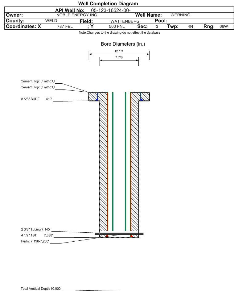 | Wellbore Completed | | Completion Date: | 2/9/1994 | | Measured TD: | 7342 ft. | Measured PB depth: | 0 ft. | | True Vertical TD: | 0 ft. | True Vertical PB depth: | | | Top PZ Location: | Sec: Twp: | Footage: 0 FL 0 FL | | Casing: | String Type: SURF, Hole Size: 12.25 in., Size: 8.625 in., Top: 0 ft., Depth: 419 ft., Weight: 23 , Citings Type: ACTUAL | | Cement: | Sacks: 348, Top: 0 ft., Bottom: 419 ft., Determination Method: VISU | | Casing: | String Type: SURF, Hole Size: 12.25 in., Size: 8.625 in., Top: 0 ft., Depth: 419 ft., Weight: , Citings Type: HISTORICAL | | Cement: | Sacks: 348, Top: 0 ft., Bottom: , Determination Method: | | Casing: | String Type: 1ST, Hole Size: 7.875 in., Size: 4.5 in., Top: 0 ft., Depth: 7338 ft., Weight: 11.6 , Citings Type: ACTUAL | | Cement: | Sacks: 205, Top: 6197 ft., Bottom: 7338 ft., Determination Method: CBL | | Casing: | String Type: 1ST, Hole Size: 7.875 in., Size: 4.5 in., Top: 0 ft., Depth: 7338 ft., Weight: , Citings Type: HISTORICAL | | Cement: | Sacks: 0, Top: 0 ft., Bottom: , Determination Method: | | Casing: | String Type: S.C. 1.1, Hole Size: 7.875 in., Size: 4.5 in., Top: 0 ft., Depth: 7338 ft., Weight: 11.6 , Citings Type: ACTUAL | | Cement: | Sacks: 290, Top: 3510 ft., Bottom: 4916 ft., Determination Method: CBL | | Formation | Interval Top | Log Bottom | Cored | DSTs | | PARKMAN | 3606 ft. | | | | | SUSSEX | 4292 ft. | | | | | SHANNON | 4752 ft. | | | | | NIOBRARA | 6868 ft. | | | | | FORT HAYS | 7185 ft. | | | | | CODELL | 7198 ft. | | | |
