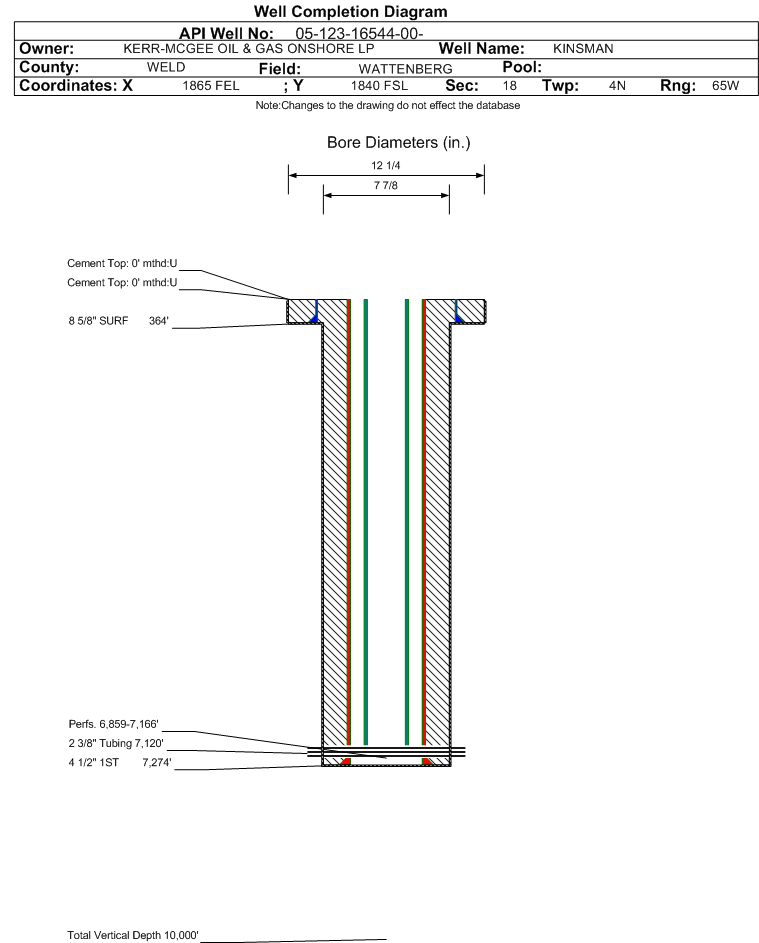 | Wellbore Completed | | Completion Date: | 1/14/1993 | | Measured TD: | 7278 ft. | Measured PB depth: | 7238 ft. | | True Vertical TD: | 0 ft. | True Vertical PB depth: | | | Casing: | String Type: SURF, Hole Size: 12.25 in., Size: 8.625 in., Top: 0 ft., Depth: 364 ft., Weight: 24 , Citings Type: ACTUAL | | Cement: | Sacks: 100, Top: 0 ft., Bottom: 364 ft., Determination Method: VISU | | Casing: | String Type: 1ST, Hole Size: 7.875 in., Size: 4.5 in., Top: 0 ft., Depth: 7274 ft., Weight: 11.6 , Citings Type: ACTUAL | | Cement: | Sacks: 200, Top: 6310 ft., Bottom: 7274 ft., Determination Method: CBL | | Casing: | String Type: S.C. 1.1, Hole Size: , Size: , Top: , Depth: 4764 ft., Weight: , Citings Type: ACTUAL | | Cement: | Sacks: 300, Top: 4080 ft., Bottom: 4764 ft., Determination Method: CBL | | Formation | Interval Top | Log Bottom | Cored | DSTs | | SUSSEX | 4424 ft. | | | | | NIOBRARA | 6842 ft. | | | | | CODELL | 7155 ft. | | | |