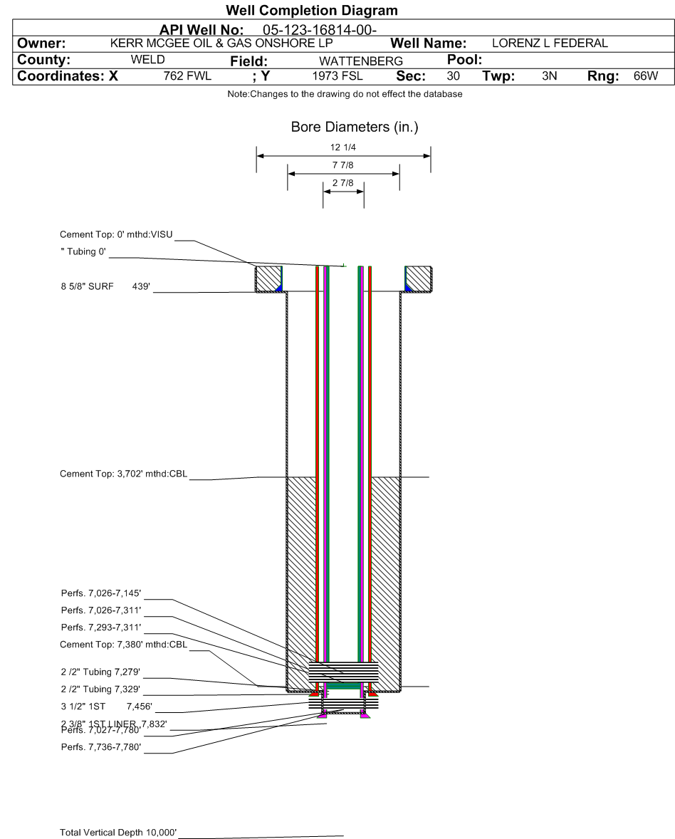 | | Perforation Data: | | Interval Top: | 7026 ft. | # Of Holes: | 203 | | Interval Bottom: | 7311 ft. | Hole Size: | 0.32 in. |