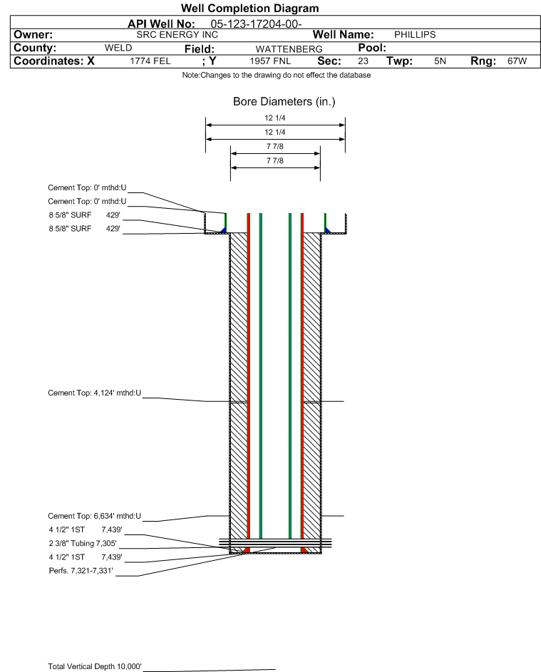 | Wellbore Completed | | Completion Date: | 9/13/1993 | | Measured TD: | 7471 ft. | Measured PB depth: | 7409 ft. | | True Vertical TD: | 0 ft. | True Vertical PB depth: | | | Casing: | String Type: SURF, Hole Size: 12.25 in., Size: 8.625 in., Top: 0 ft., Depth: 429 ft., Weight: 24 , Citings Type: ACTUAL | | Cement: | Sacks: 300, Top: 0 ft., Bottom: 429 ft., Determination Method: VISU | | Casing: | String Type: 1ST, Hole Size: 7.875 in., Size: 4.5 in., Top: 0 ft., Depth: 7439 ft., Weight: 11.6 , Citings Type: ACTUAL | | Cement: | Sacks: 200, Top: 6620 ft., Bottom: 7439 ft., Determination Method: CBL | | Casing: | String Type: S.C. 1.1, Hole Size: 7.875 in., Size: 4.5 in., Top: 0 ft., Depth: 4156 ft., Weight: 11.6 , Citings Type: ACTUAL | | Cement: | Sacks: 185, Top: 1200 ft., Bottom: 4156 ft., Determination Method: CBL | | Formation | Interval Top | Log Bottom | Cored | DSTs | | NIOBRARA | 6975 ft. | | | | | CODELL | 7318 ft. | | | |