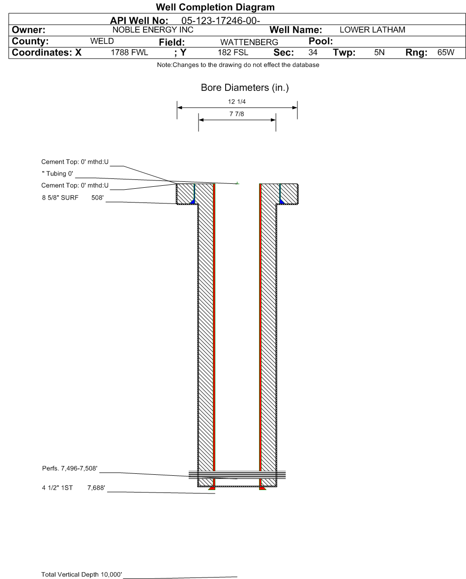 Formation CODL Formation Classification: GW Status: AB - 6/15/2023 Interval Top: 7496 ft. Interval Bottom: 7508 ft.| Completed Information for Formation CODELL | | 1st Production Date: | 11/5/1993 | Choke Size: | | | Formation Name: | CODELL | Commingled: | No | | Production Method: | | | Open Hole Completion: | No |