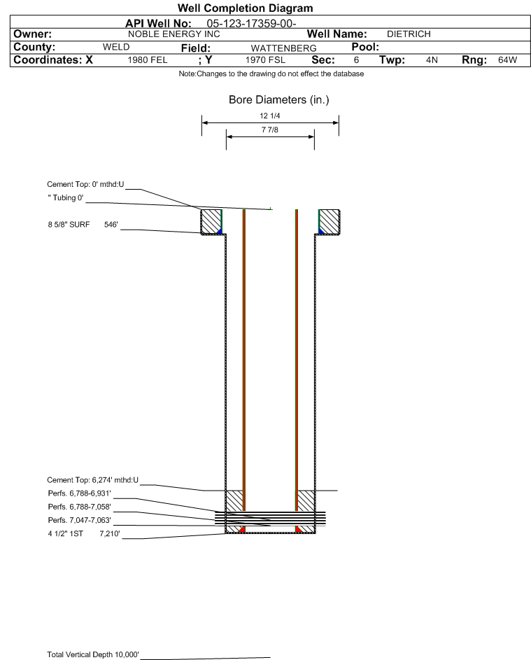 Wellbore #00 Wellbore Classification: OW Status: PA - 8/6/2019 Measured TD: 7274 ft.| Wellbore Data for Original Wellbore | Wellbore Classification: OW PA - 8/6/2019 | | Wellbore Permit | DRIFTED | | Permit #: | 19931262 | Expiration Date: | 1/11/1994 | | Proposed Depth/Form: | 7167 ft. | | Surface Mineral Owner Same: | Yes | | Mineral Owner: | FEE | Surface Owner: | FEE | | Unit: | | Unit Number: | | | Formation And Spacing: | Code: NB-CD , Formation: NIOBRARA-CODELL , Order: 407 , Unit Acreage: 80, Drill Unit: W2SE4 |