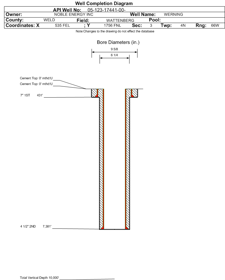 Wellbore #00 Wellbore Classification: GW Status: PR - 3/1/2024 Measured TD: 7383 ft. Vertical TD: 0 ft.| Wellbore Data for Original Wellbore | Wellbore Classification: GW PR - 3/1/2024 | | Wellbore Permit | | | Permit #: | 931374 | Expiration Date: | 1/25/1994 | | Proposed Depth/Form: | | | Surface Mineral Owner Same: | Not available | | Mineral Owner: | FEE | Surface Owner: | Not available | | Unit: | | Unit Number: | | | Formation And Spacing: | Code: NB-CD , Formation: NIOBRARA-CODELL , Order: 0 , Unit Acreage: 80, Drill Unit: E2NE |