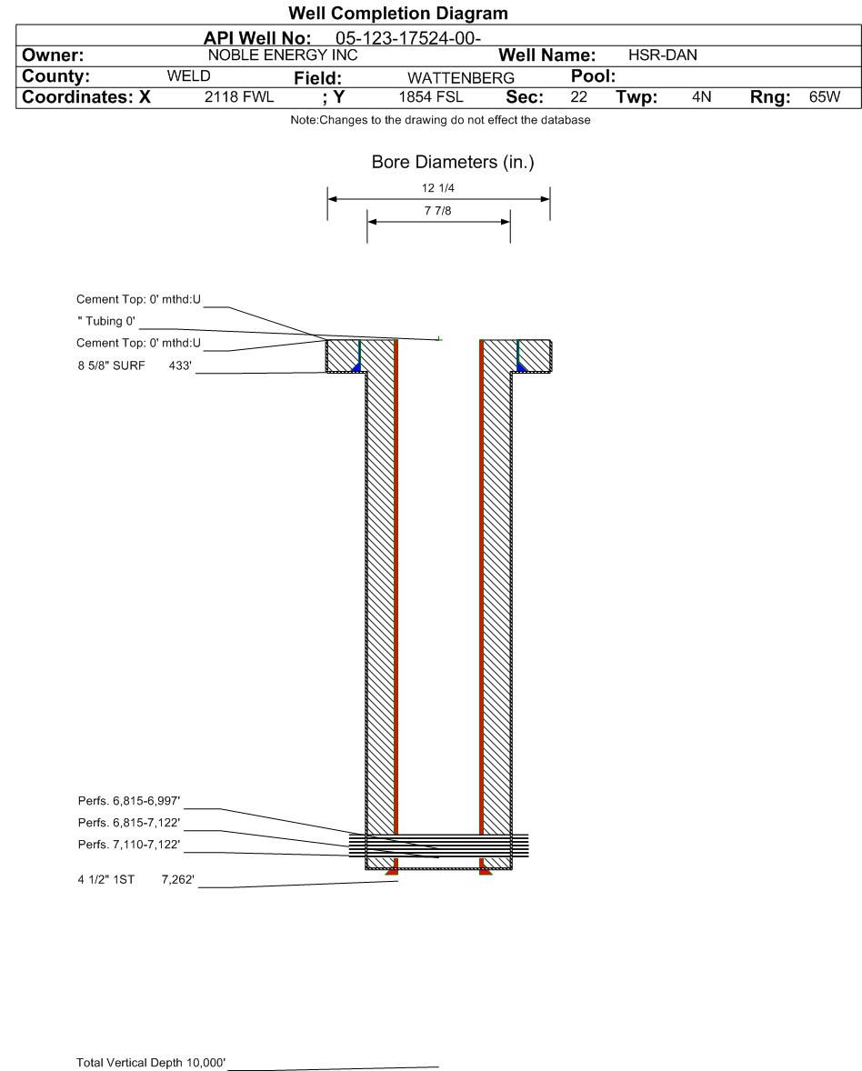 | | Perforation Data: | | Interval Top: | 6815 ft. | # Of Holes: | 97 | | Interval Bottom: | 7122 ft. | Hole Size: | |
